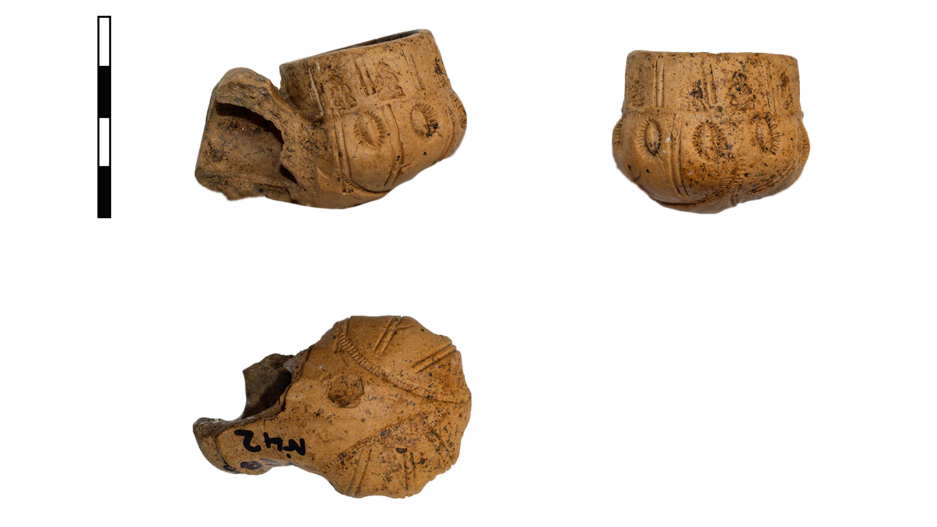 Красноглиняная курительная трубка, фасон тахта-чубук. Составляющими формы является 8-гранная втулка с килем и валиком, 10-гранные чашечка и венчик, также разделенные рельефным валиком. Ребра между гранями чашечки и венчика выделены двойными разделительными линиями, ограничивающими орнаментальные поля. Орнамент на венчике состоит из 3 рядов полупальметок, обращенных вверх. Чашечка содержит орнамент, напоминающий изображение раковины-каури. Киль и валик втулки выделены штампованным изображением зубчатого колеса.