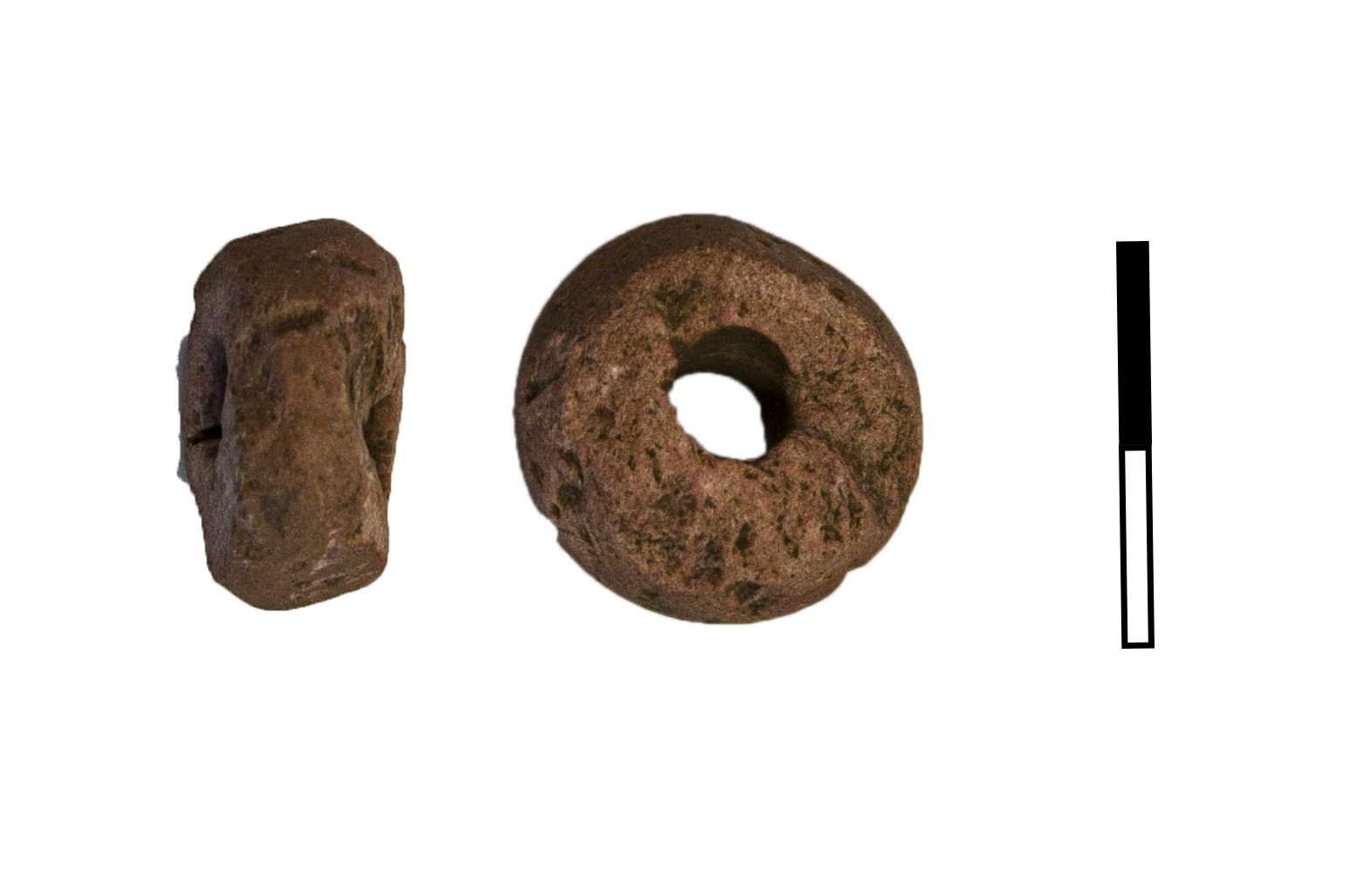 Биконическое пряслице из розового шифера. На внутренней части имеются потертости от нитей. С одной стороны часть плоскости сколота.