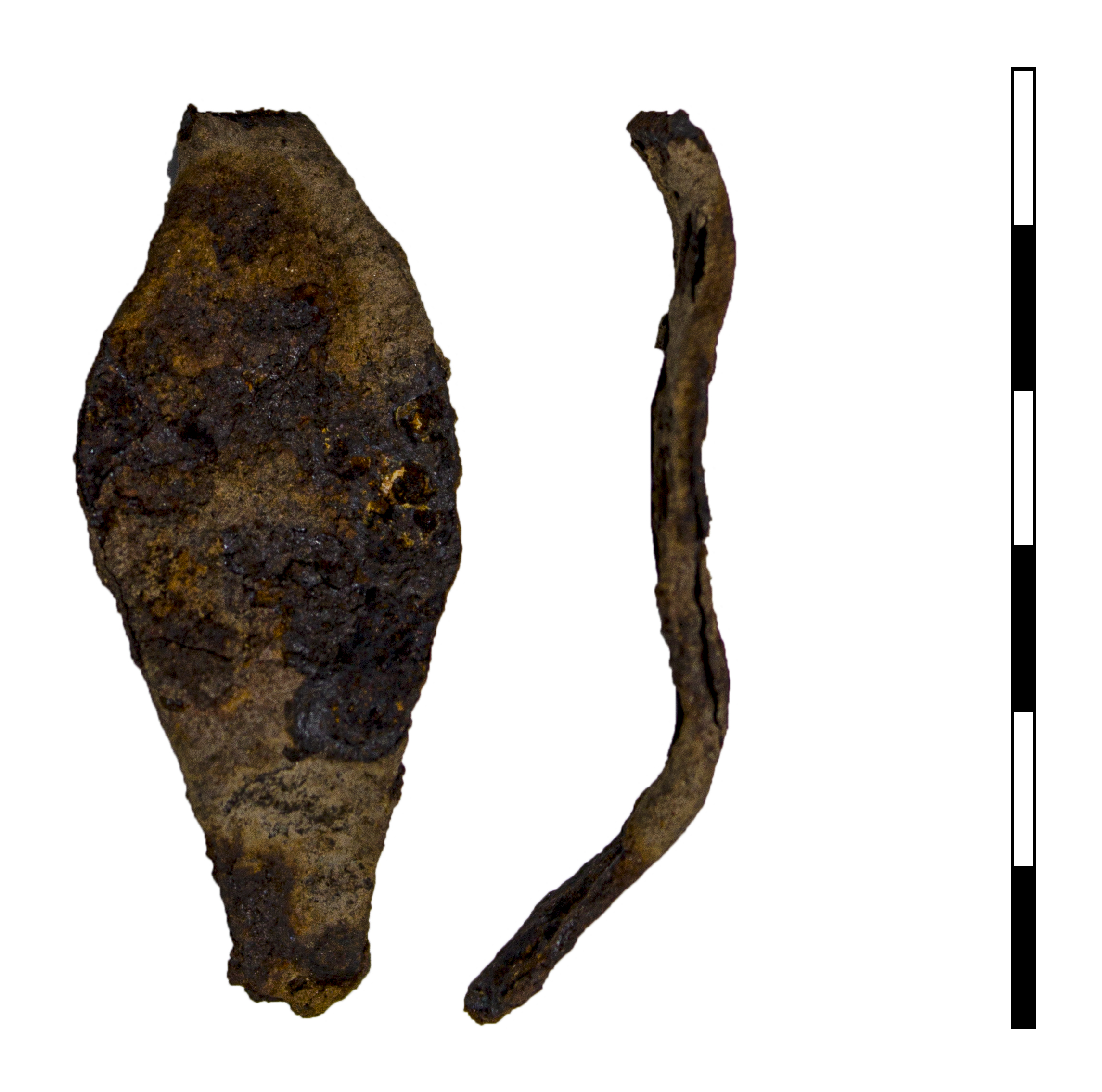 Железная скоба с расширяющейся средней частью. Возможно, съемный ледоходный шип для обуви. По результатам металлографического анализа цельнометаллический, при изготовлении использована сырцовая сталь.