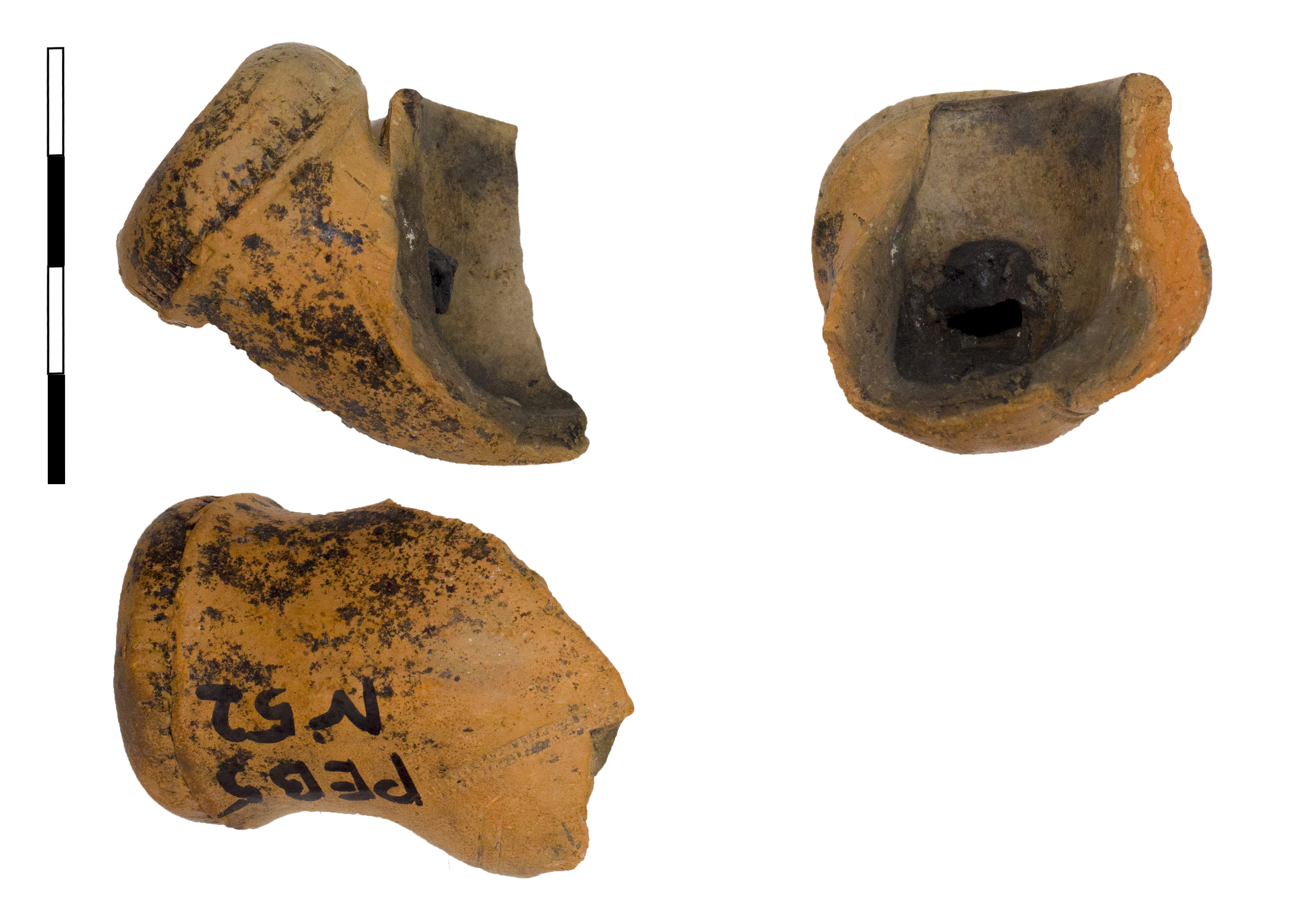 Красноглиняная курительная трубка, фасон тахта-чубук. Составляющими формы является 8-гранная втулка с килем и валиком, 10-гранные чашечка и венчик, также разделенные рельефным валиком. Ребра между гранями чашечки и венчика выделены двойными разделительными линиями, ограничивающими орнаментальные поля. Орнамент на венчике состоит из 3 рядов полупальметок, обращенных вверх. Чашечка содержит орнамент, напоминающий изображение раковины-каури. Киль и валик втулки выделены штампованным изображением зубчатого колеса.