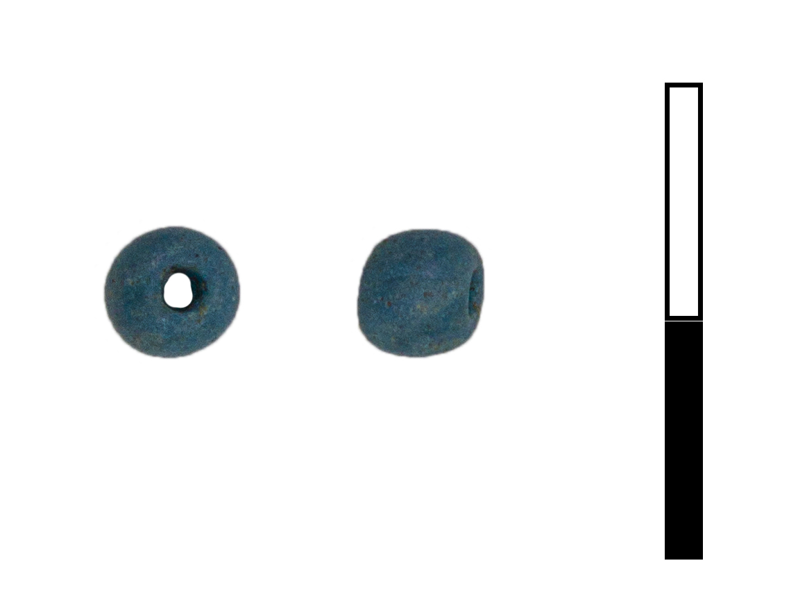 Бусина округлой формы из полупрозрачного голубого стекла, выполненная в технике тянутой трубочки с дополнительной обработкой. Поверхность покрыта белесой патиной.