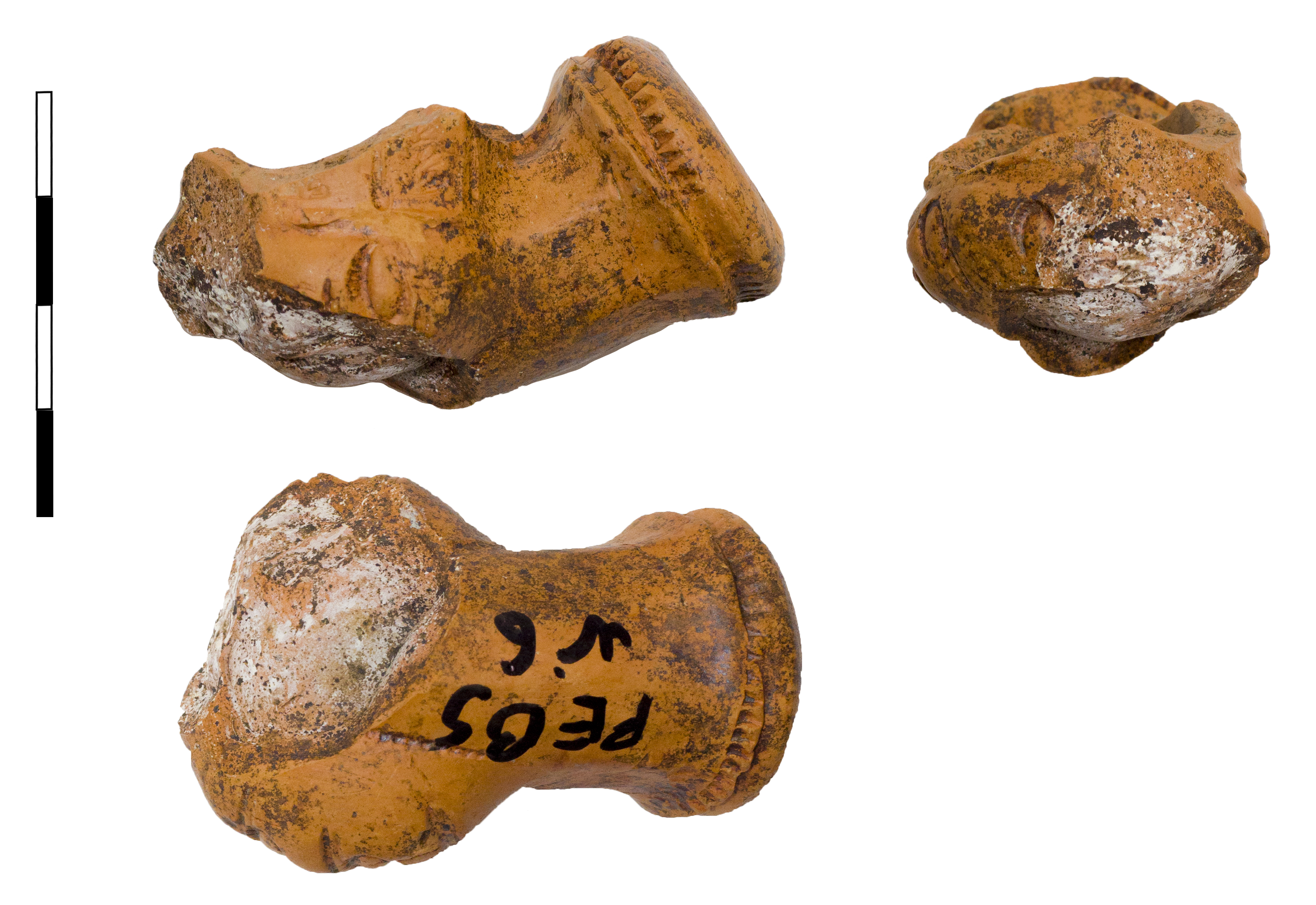 Красноглиняная курительная трубка, фасон тахта-чубук. Составляющими формы является 8-гранная втулка с килем и валиком, 10-гранные чашечка и венчик, также разделенные рельефным валиком. Ребра между гранями чашечки и венчика выделены двойными разделительными линиями, ограничивающими орнаментальные поля. Орнамент на венчике состоит из 3 рядов полупальметок, обращенных вверх. Чашечка содержит орнамент, напоминающий изображение раковины-каури. Киль и валик втулки выделены штампованным изображением зубчатого колеса.