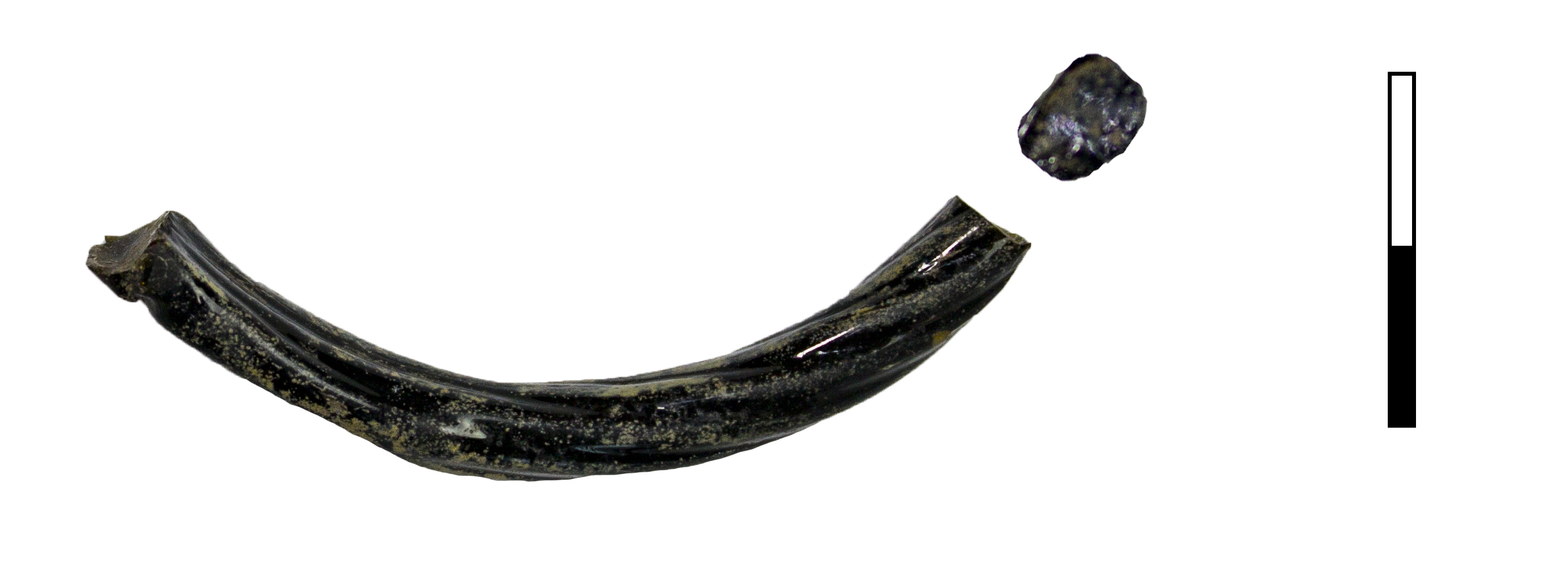 Фрагмент крученого браслета.. Перекрут на данном фрагменте браслета равномерный, крупный. Диаметр стержня – 5 мм, диаметр самого браслета 6 см. Стекло прозрачное, коричневого цвета, на блестящей поверхности пятна белесой патины.