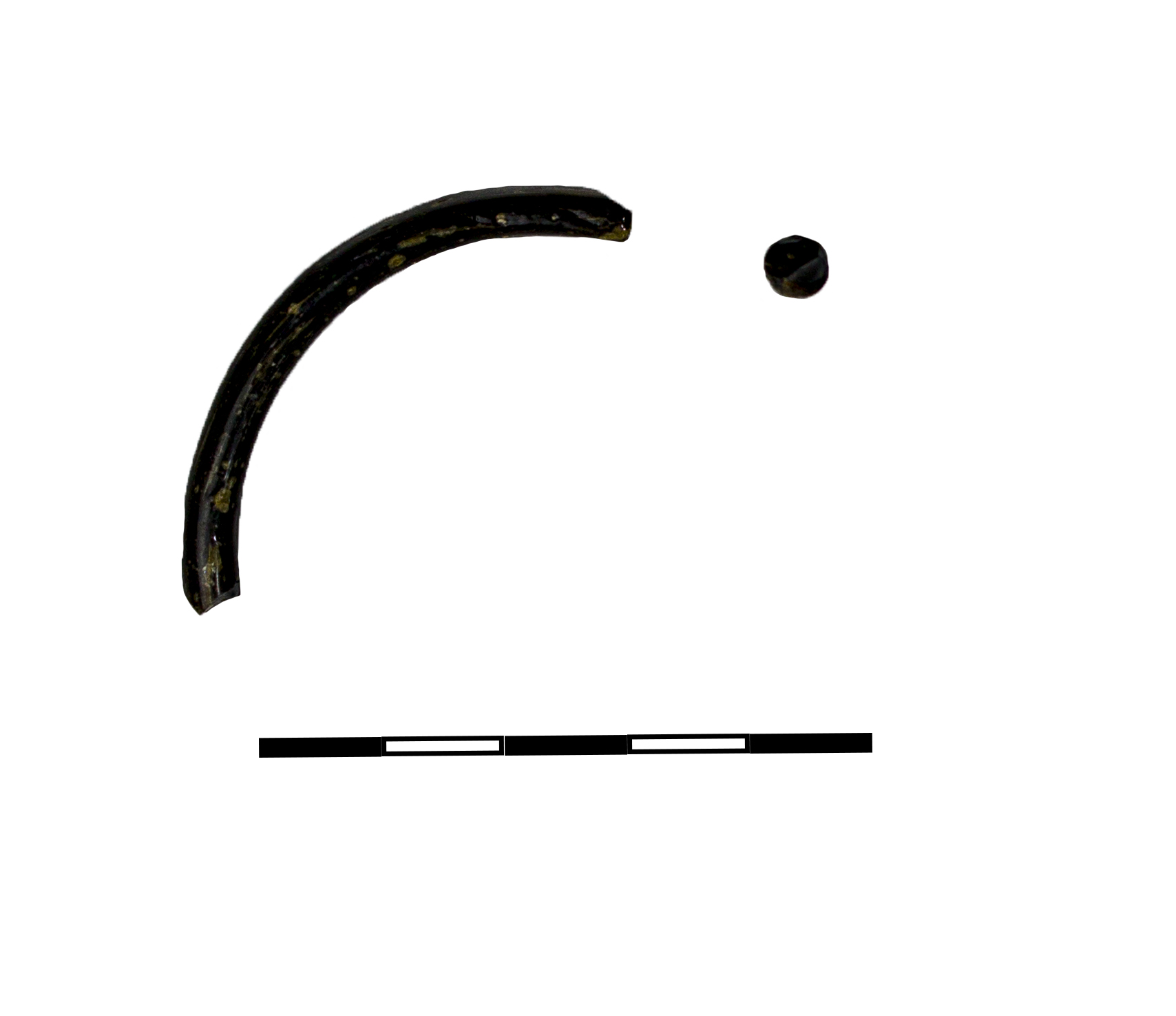 Браслет крученый ребристый из стекла коричневого цвета с перевитьем желтой нитью. Сечение в форме розетки. Диаметр обруча 5,6 см. Изготовлен вытягиванием дрота с одновременным кручением и дальнейшим формованием в кольцо. Поверхность патинирована. Результаты эмиссионно-спектрального анализа (За значимые приняты содержания от 0,01%, для значений ниже 1% приводится одна значащая цифра, выше – две, достижимая чувствительность по K2O около 1%. Содержание SiO2 не определялось, оно является основой, если сумма остальных компонентов не превышает 50%)):