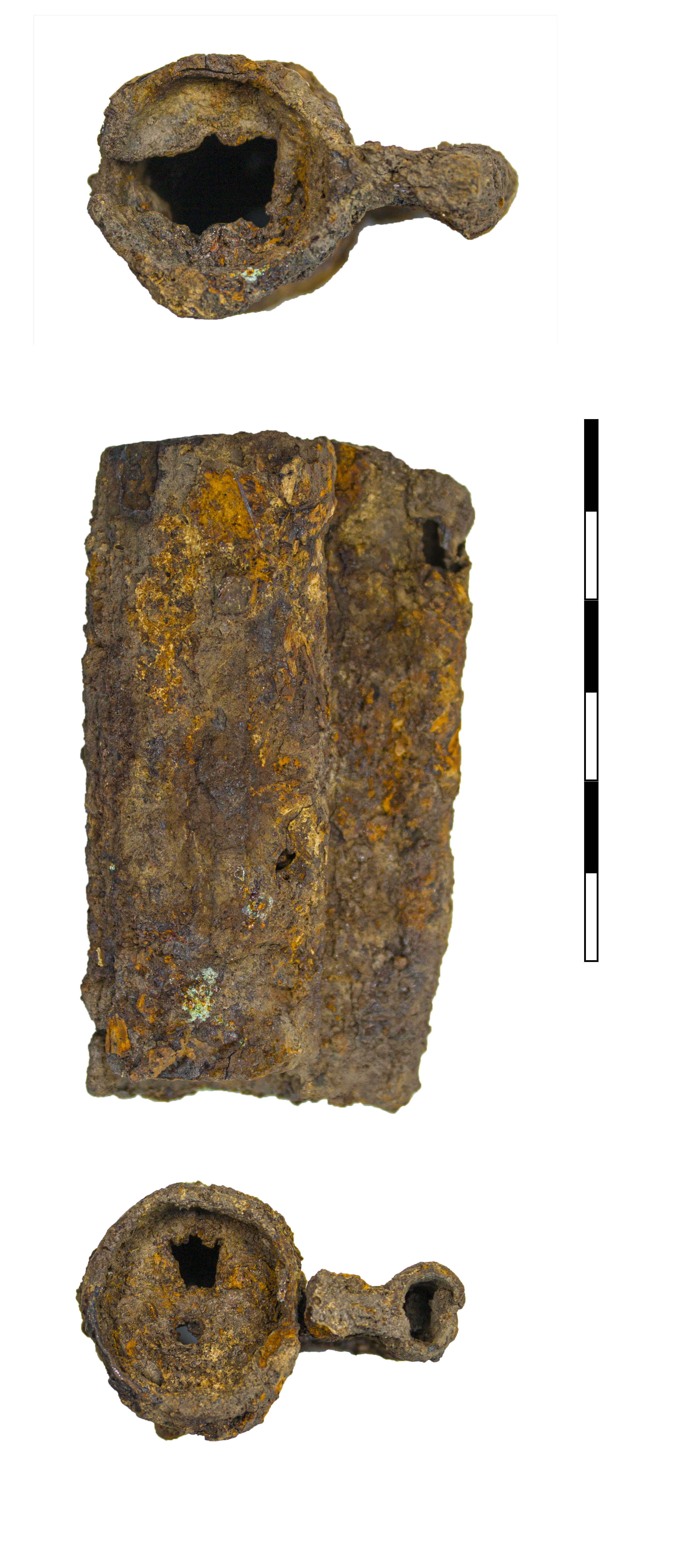 Цилиндрический замок типа В, вариант 1 (по Б.А. Колчину). Ключевая щель располагается в донце большого цилиндра. Чтобы отпереть замок, лопасть ключа вставляли в прорезь, утапливали в нее, а затем поворачивали плоский стержень замка на 90ͦ и вдвигали его в цилиндр.
