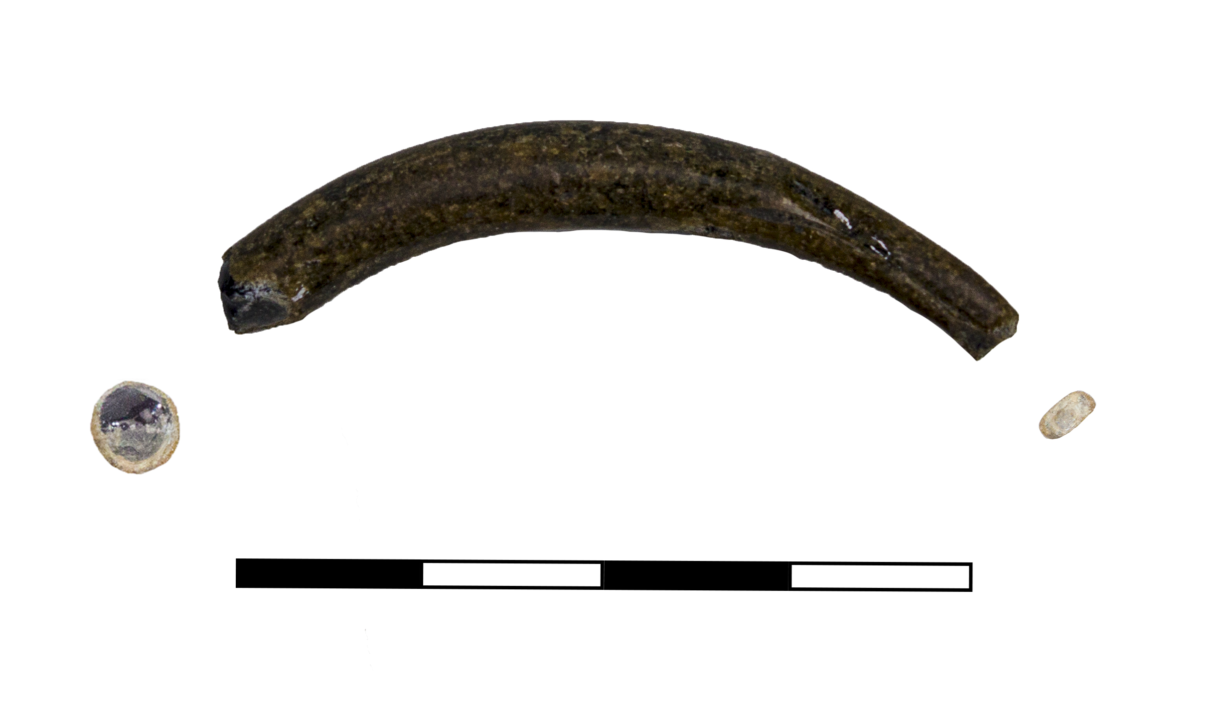 Браслет гладкий из стекла синего цвета. Сечение округлое с одной стороны и уплощенное с другой. Диаметр обруча 6 см. Выполнен простым свободным вытягиванием стеклянного дрота и формованием его в кольцо. Поверхность патинирована.