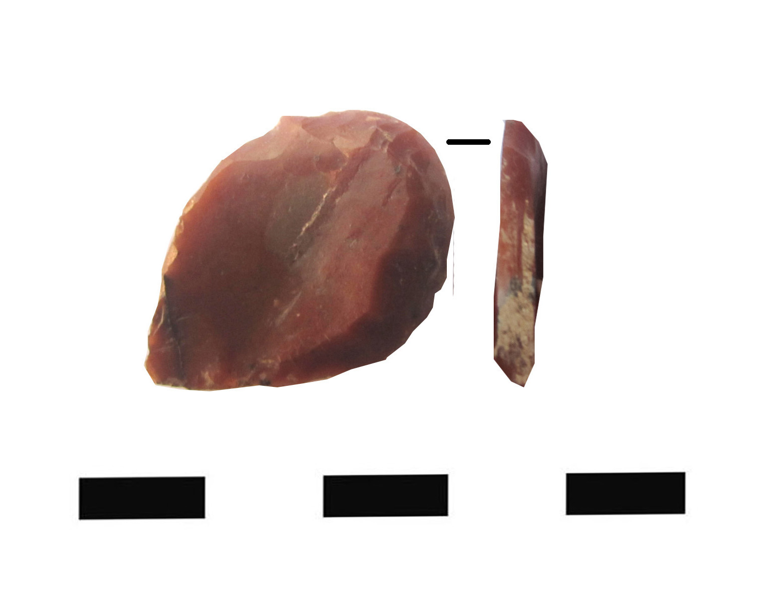 Подкруглый ретушированный скребок на основе отщепа из «красного» кремния.