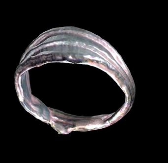 Медный, слегка деформированый перстень, отлитый по восковой модели. Щиток украшен тремя валиками, два из которых идут по краям, а один по центру. Все три валика в уменьшенном виде прослеживаются и в нижней части кольца. Заметны технологические швы, присутствовавшие на восковой модели. Подобный перстень был найден на Сарском городище. По всей видимости, такие украшения можно отнести к мерянской ювелирной традиции.