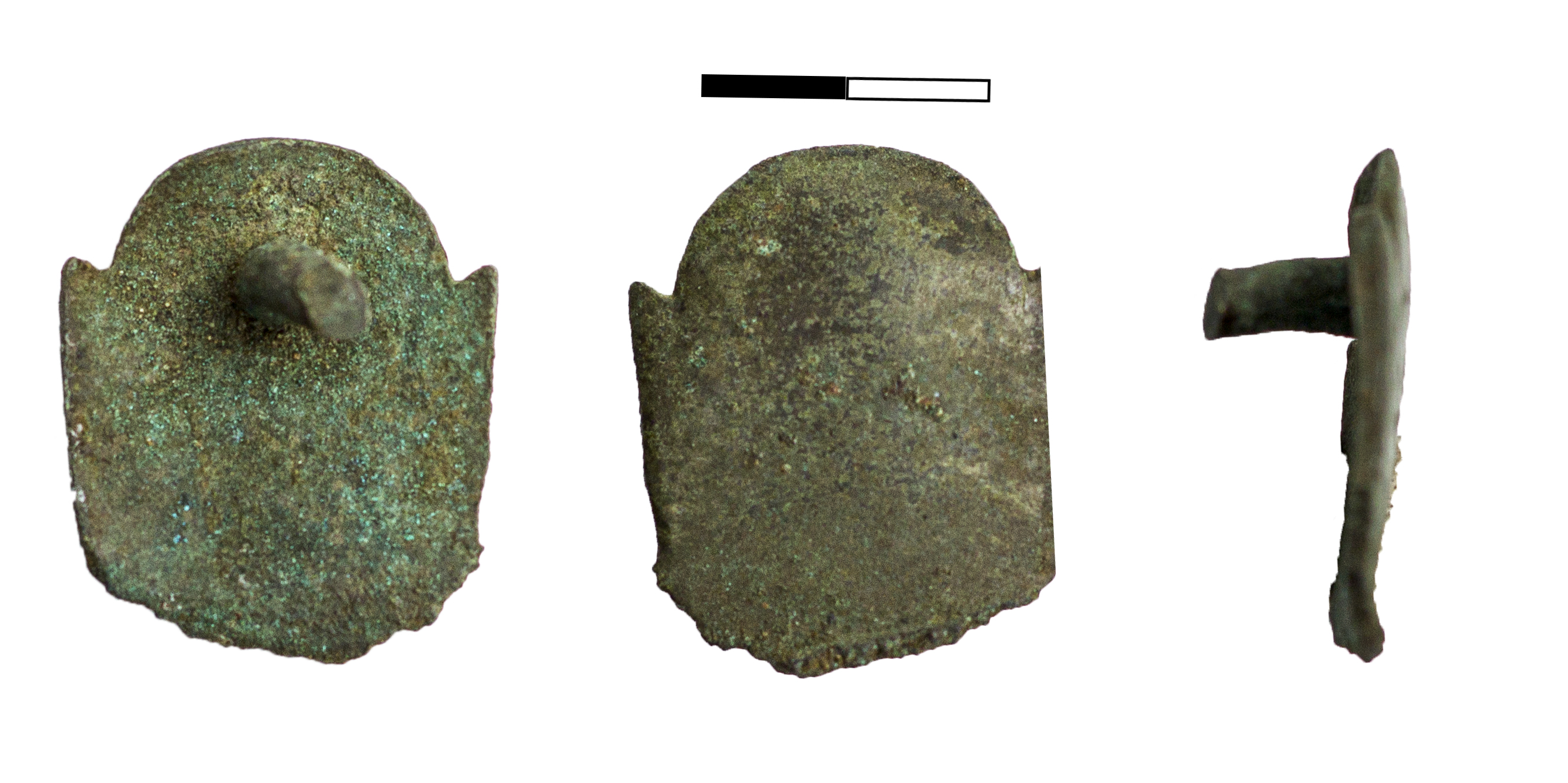 Медная накладка с параллельными боковыми краями и округлыми завершениями и выступающими зубцами, сзади чуть согнутый штифт. Поверхность покрыта зеленой патиной. Вероятно, использовалась в качестве декора предметов интерьера.