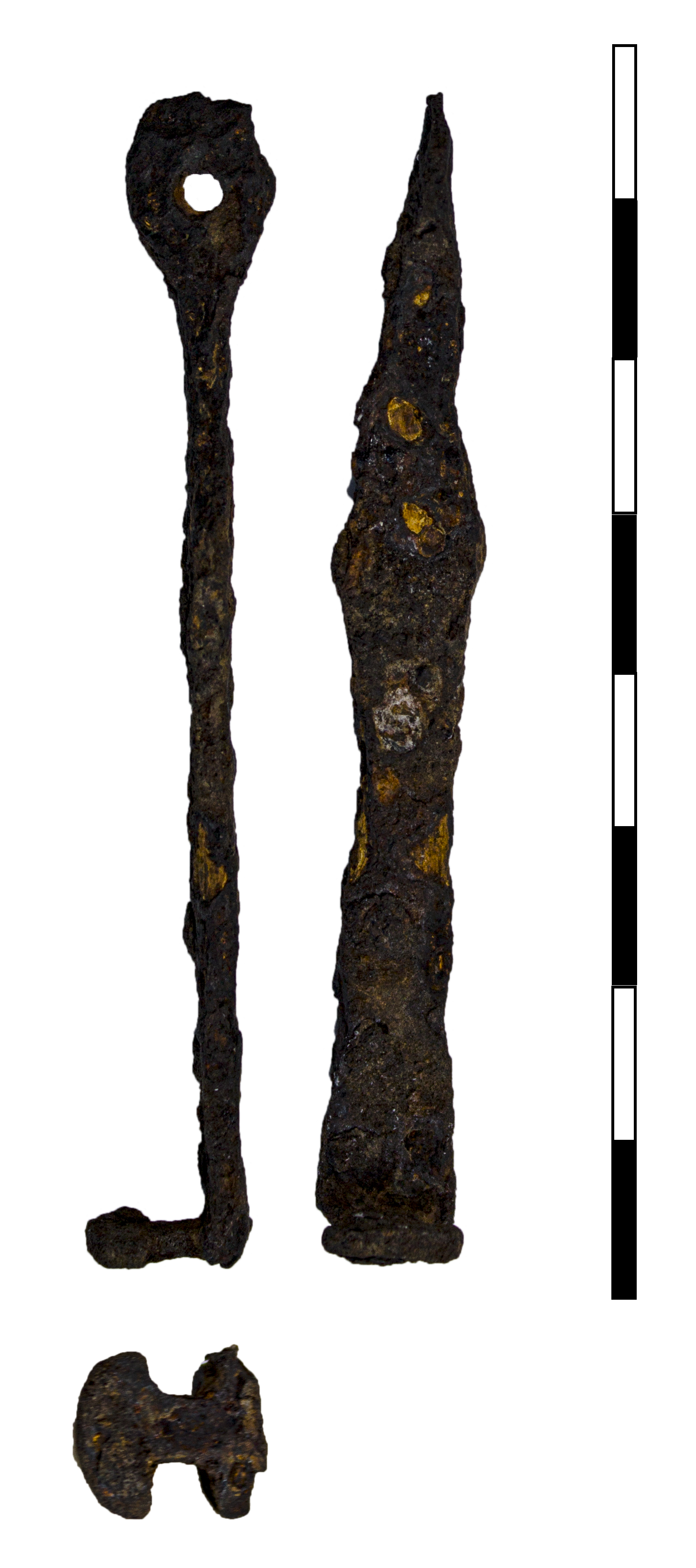 Фрагмент ключа тип В (по Б.А. Колчину). Чтобы отпереть замок, лопасть ключа вставляли в прорезь, утапливали в нее, а затем поворачивали плоский стержень замка на 90ͦ и вдвигали его в цилиндр.
