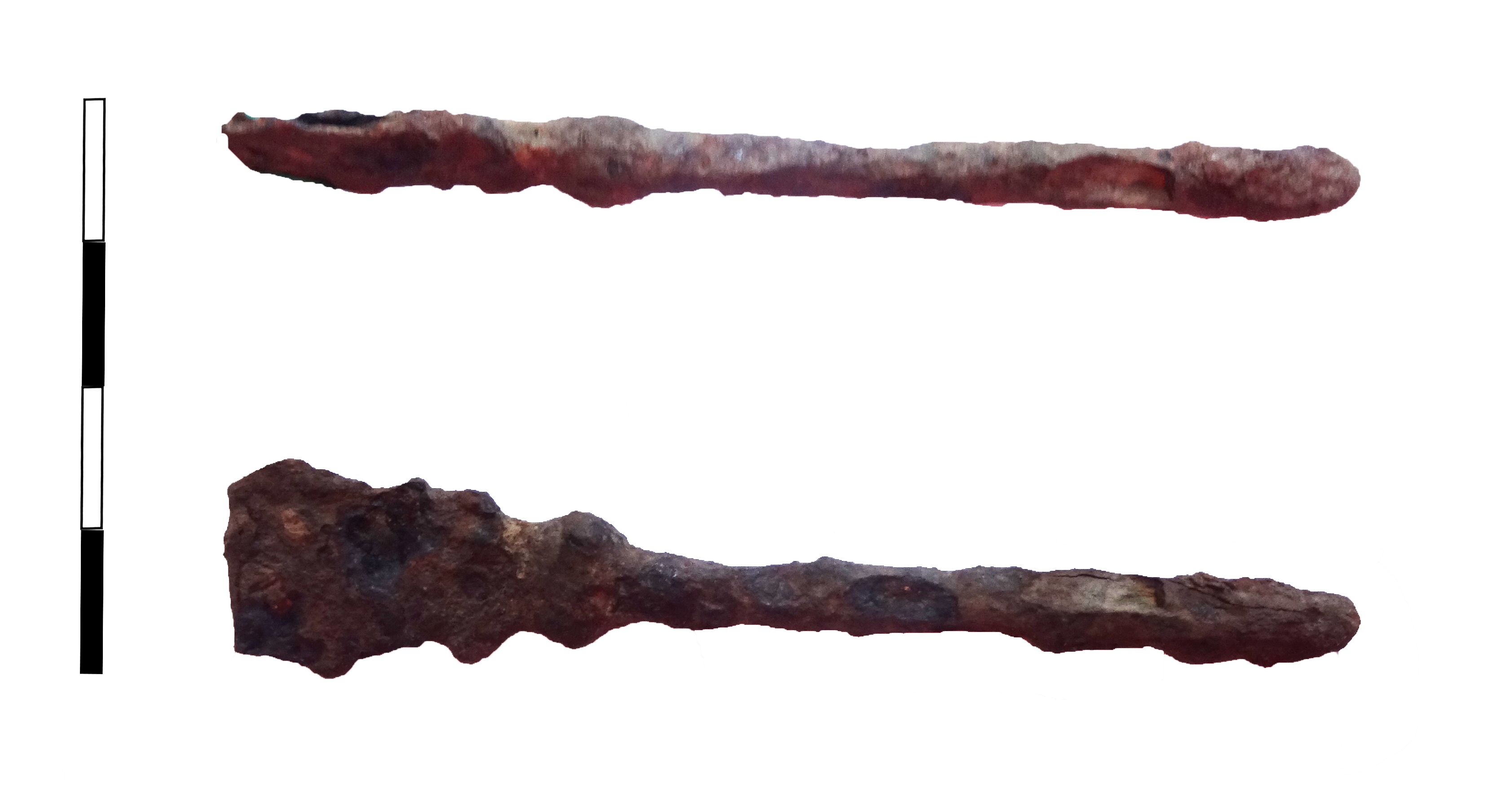 Писало – инструмент для письма на бересте или восковых табличках в виде заостренного стержня с лопаточкой на конце. Лопаточка в форме вытянутого треугольника, бока которого украшены зубчатыми выступами. Тип 11 по классификации А.Ф. Медведева.