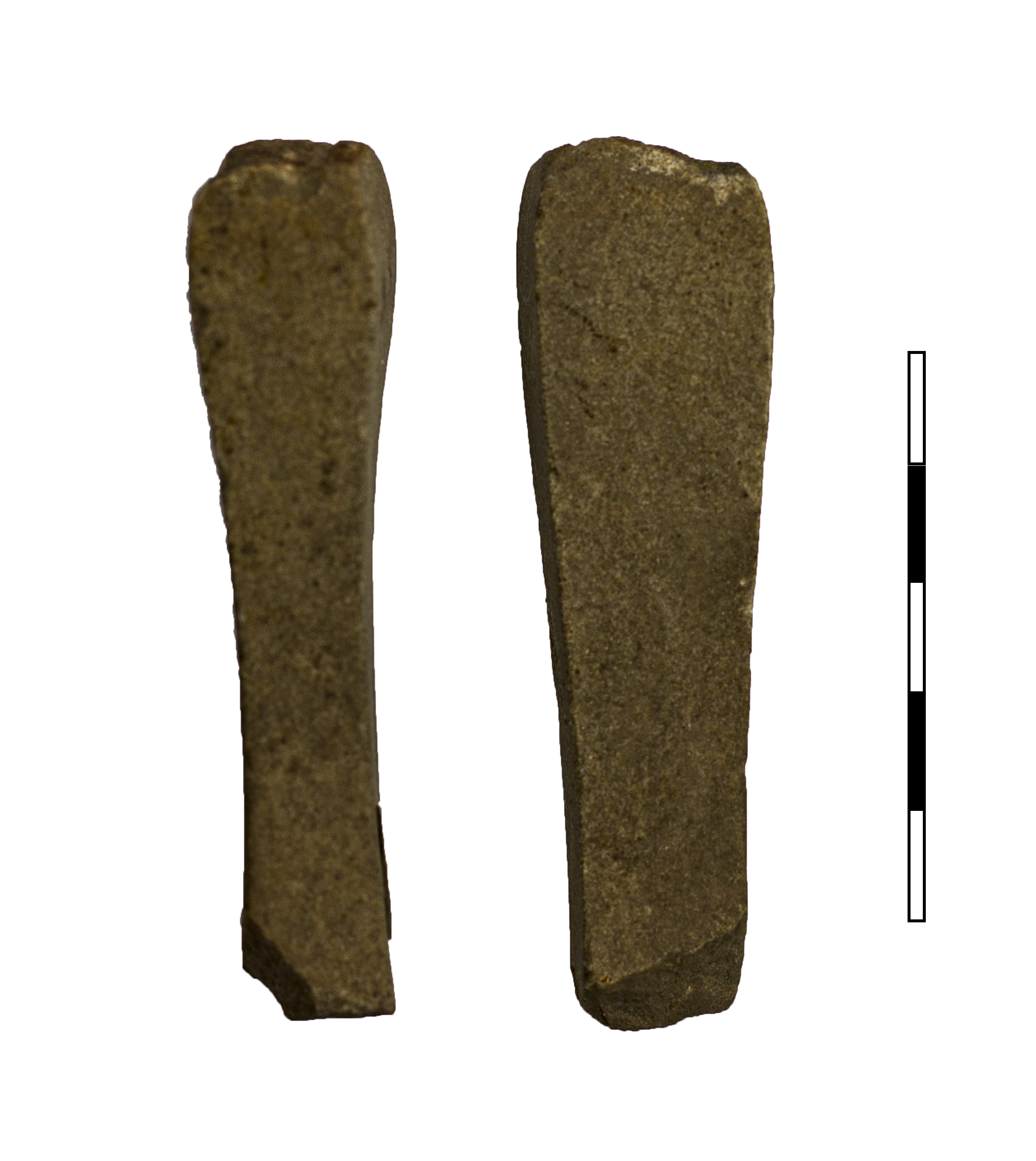 Точильный камень (оселок) из песчаника прямоугольного сечения. Эта осадочная горная порода состоит из кварца, полевых шпатов и слюды. Песчаник для точильных камней часто подбирали на берегах рек. По этой причине такие оселки называли также «водными камнями».