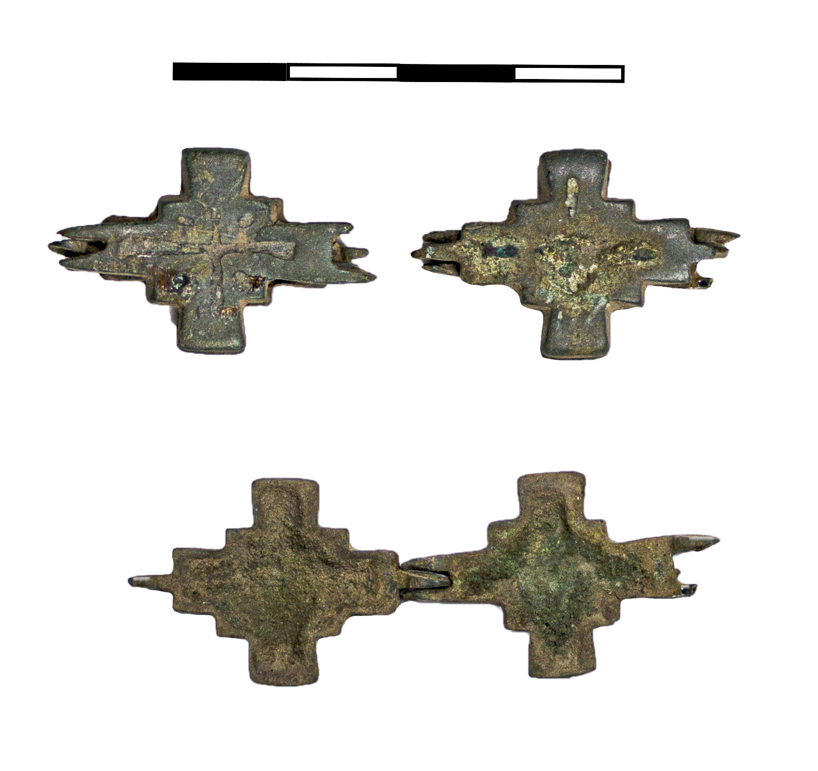 Крест-складень (реликварий) с почти прямыми, незначительно расширяющимися концами и квадратными выступами в средокрестии. На обеих сторонах – вдавленные изображения равноконечных крестов с чуть расширяющимися концами, с оборотной стороны – с сиянием (возможно, несохранившаяся инкрустация). Сам крест практически равноконечен, размеры по вертикали выше лишь за счет скрепляющих частей. Крест раскрыт, соединение створок сохранилось лишь в верхней части, ушко отсутствует.