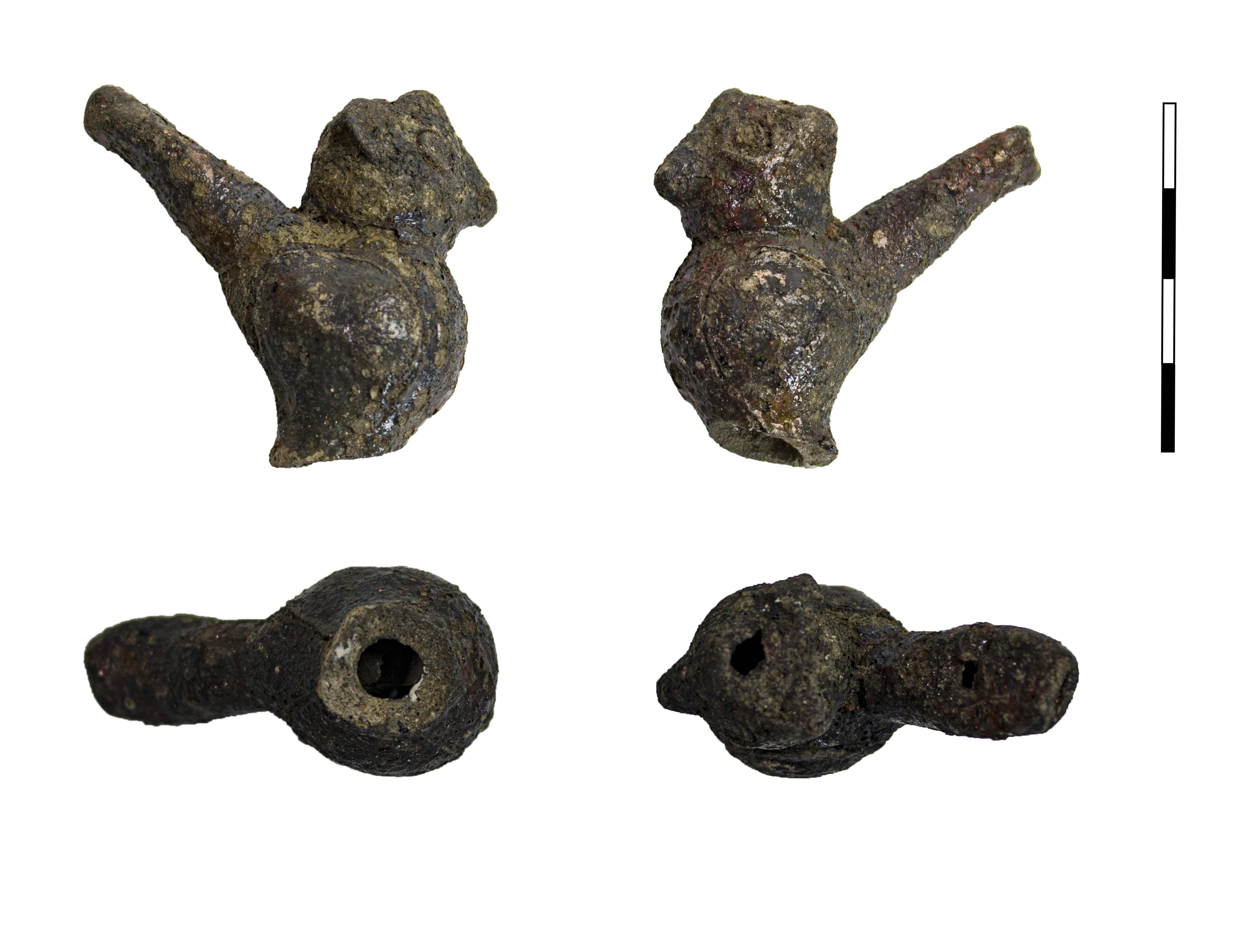 Свистулька белоглиняная в виде ушастой совы с четко прорисованными глазами и крыльями. Глаза расположены ассиметрично по отношению к налепному клюву. Покрыта коричневой пережженой поливой, возможно, гончарный брак или следы пожара. Нижняя часть сколота. Сохранились функции свистульки. Подобная свистулька немного большего размера была сделана в 2008 г. при раскопках на ул. Максимова в Ярославле.