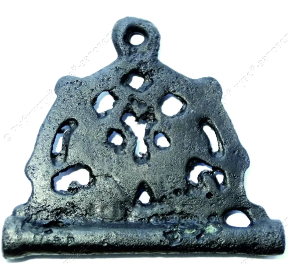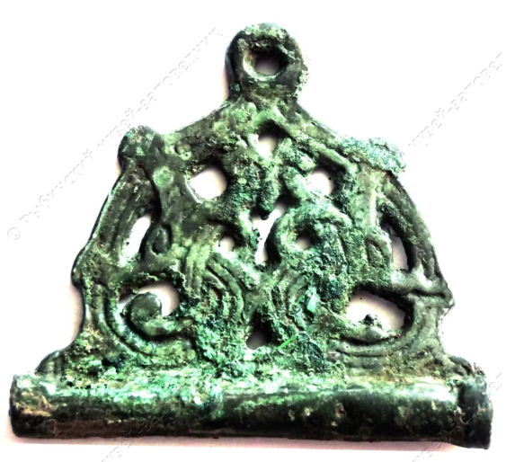 Наш игольник представляет собой бронзовую трубку с ажурным щитком полукруглой формы со сложным плетеным орнаментом и плоской петлей для подвешивания. На поверхности следы пребывания в огне. Реставрация выполнена сотрудником ИА РАН А.П. Тюпаевым.