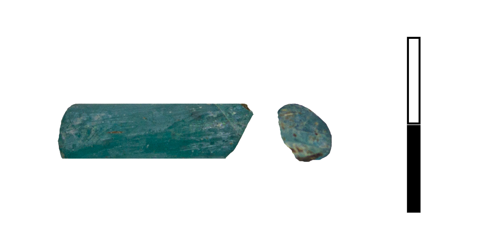 Фрагмент гладкого браслета из голубого прозрачного стекла. Диаметр стержня 3 мм. Диаметр обруча – 5 см. Поверхность блестящая, без патины.