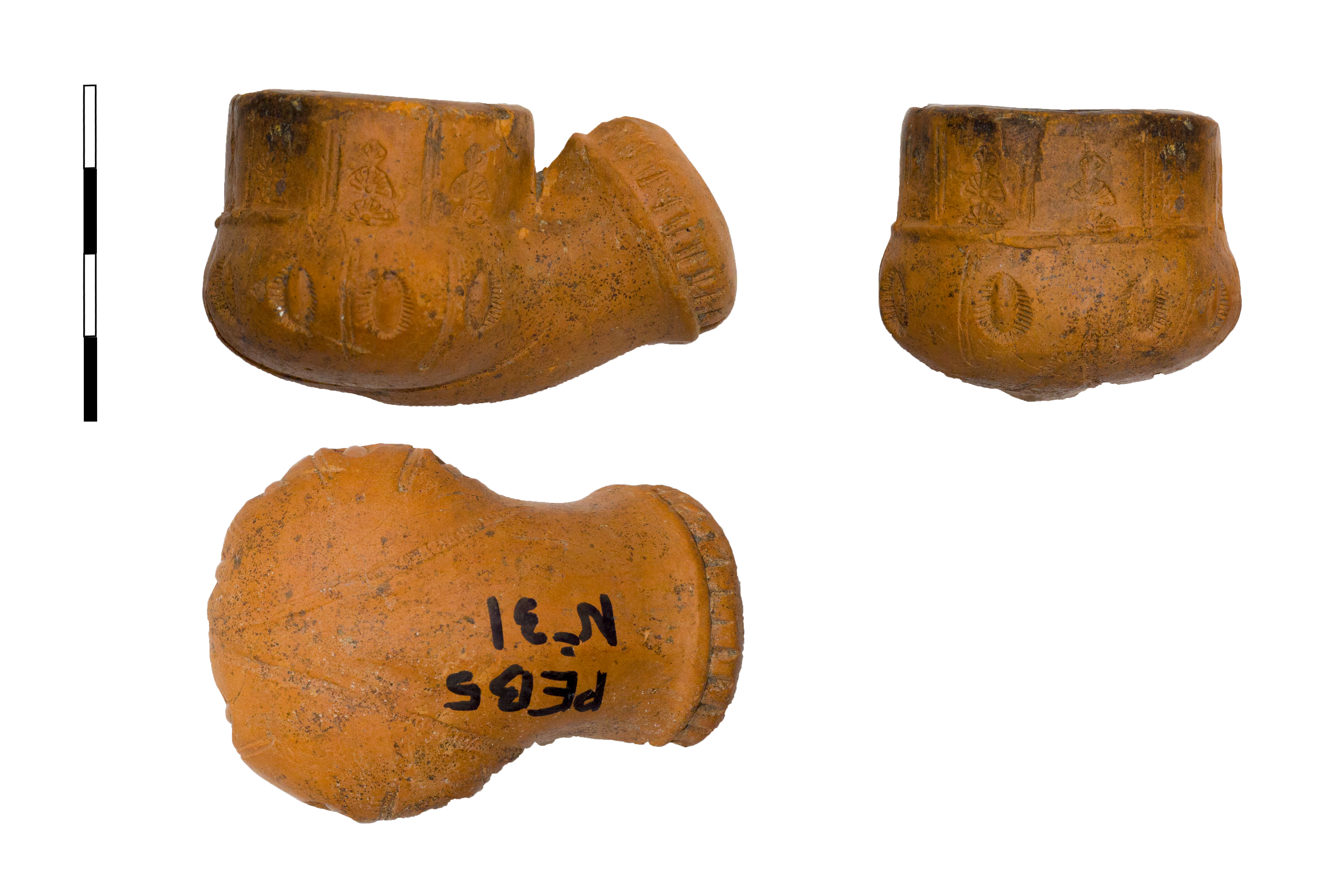 Красноглиняная курительная трубка, фасон тахта-чубук. Составляющими формы является 8-гранная втулка с килем и валиком, 10-гранные чашечка и венчик, также разделенные рельефным валиком. Ребра между гранями чашечки и венчика выделены двойными разделительными линиями, ограничивающими орнаментальные поля. Орнамент на венчике состоит из 3 рядов полупальметок, обращенных вверх. Чашечка содержит орнамент, напоминающий изображение раковины-каури. Киль и валик втулки выделены штампованным изображением зубчатого колеса.