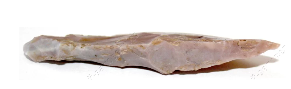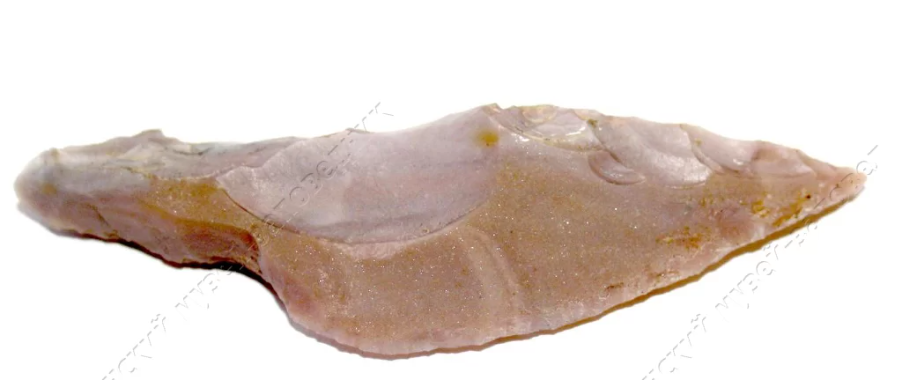 Кремневый наконечник с боковой выемкой. Особенностью таких наконечников был смещений центр тяжести, поэтому, попадая в добычу, они разворачивались и наносили рваную рану, которая увеличивалась при движении бегущего животного.
