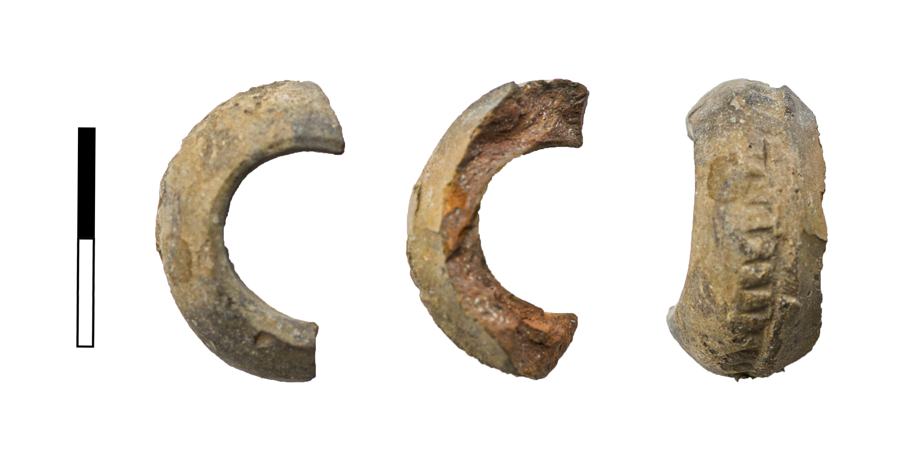 Фрагмент красноглиняной трубки. Сохранилась часть валика, выделенного зубчатым штампом. Из-за незначительности фрагмента тип трубки определить затруднительно, Предположительно, подражание турецким трубкам.