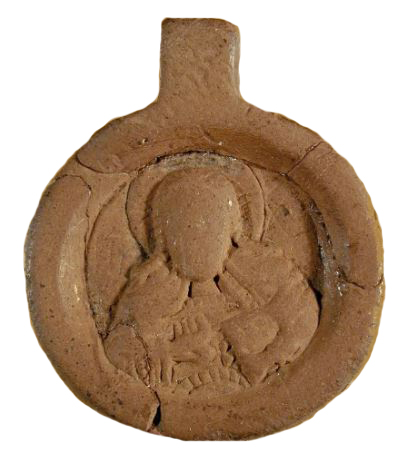 Круглая иконка из легкого глинистого сланца коричневато-желтоватого цвета. В верхней части – петля кубической формы с отверстием диаметром около 0,5 см. На лицевой стороне – ровный ободок по периметру, внутри - поясное фронтальное изображение святого с закрытым Евангелием на левой покровенной руке.