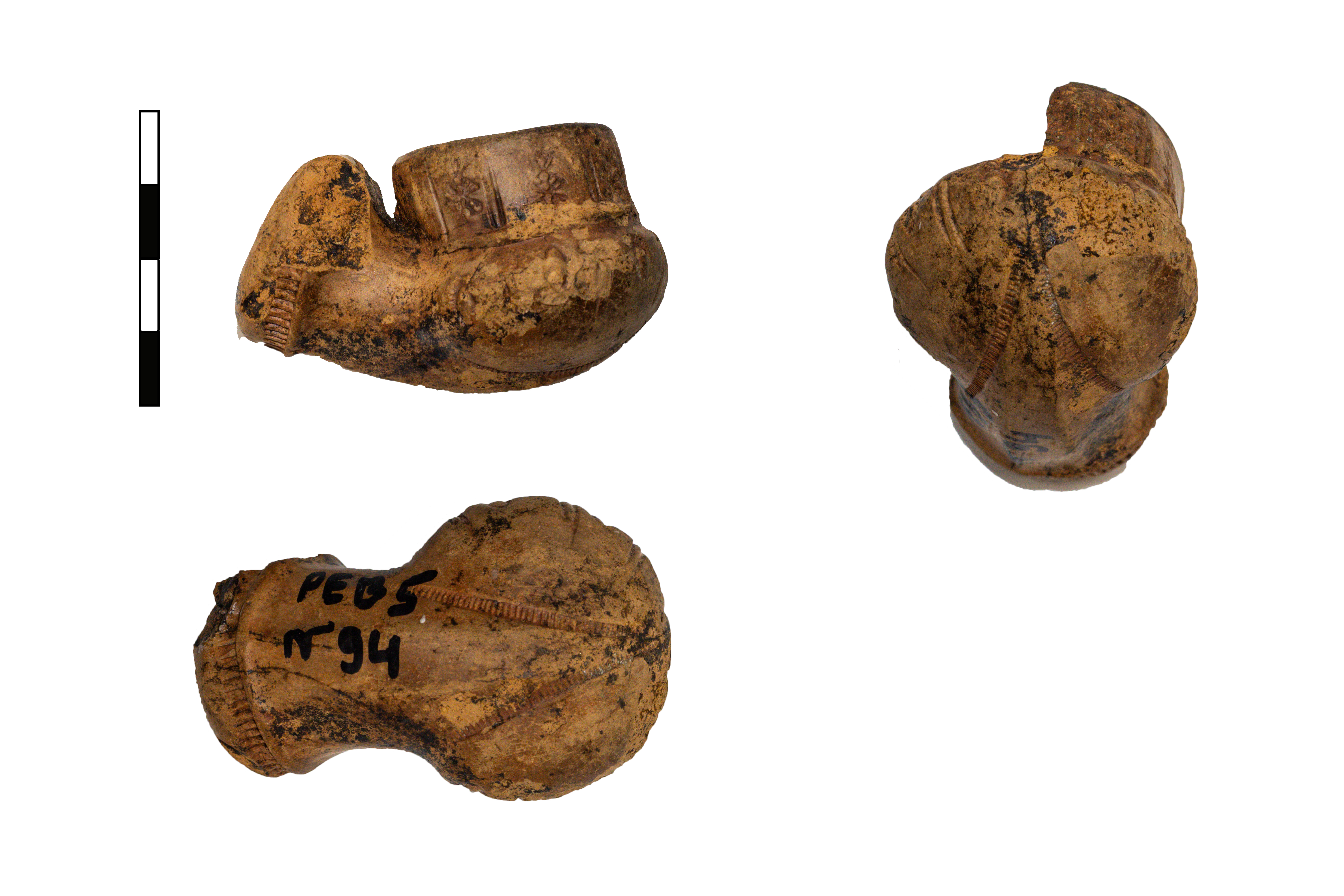 Красноглиняная курительная трубка, фасон тахта-чубук. Составляющими формы является 8-гранная втулка с килем и валиком, 10-гранные чашечка и венчик, также разделенные рельефным валиком. Ребра между гранями чашечки и венчика выделены двойными разделительными линиями, ограничивающими орнаментальные поля. Орнамент на венчике состоит из 3 рядов полупальметок, обращенных вверх. Чашечка содержит орнамент, напоминающий изображение раковины-каури. Киль и валик втулки выделены штампованным изображением зубчатого колеса.