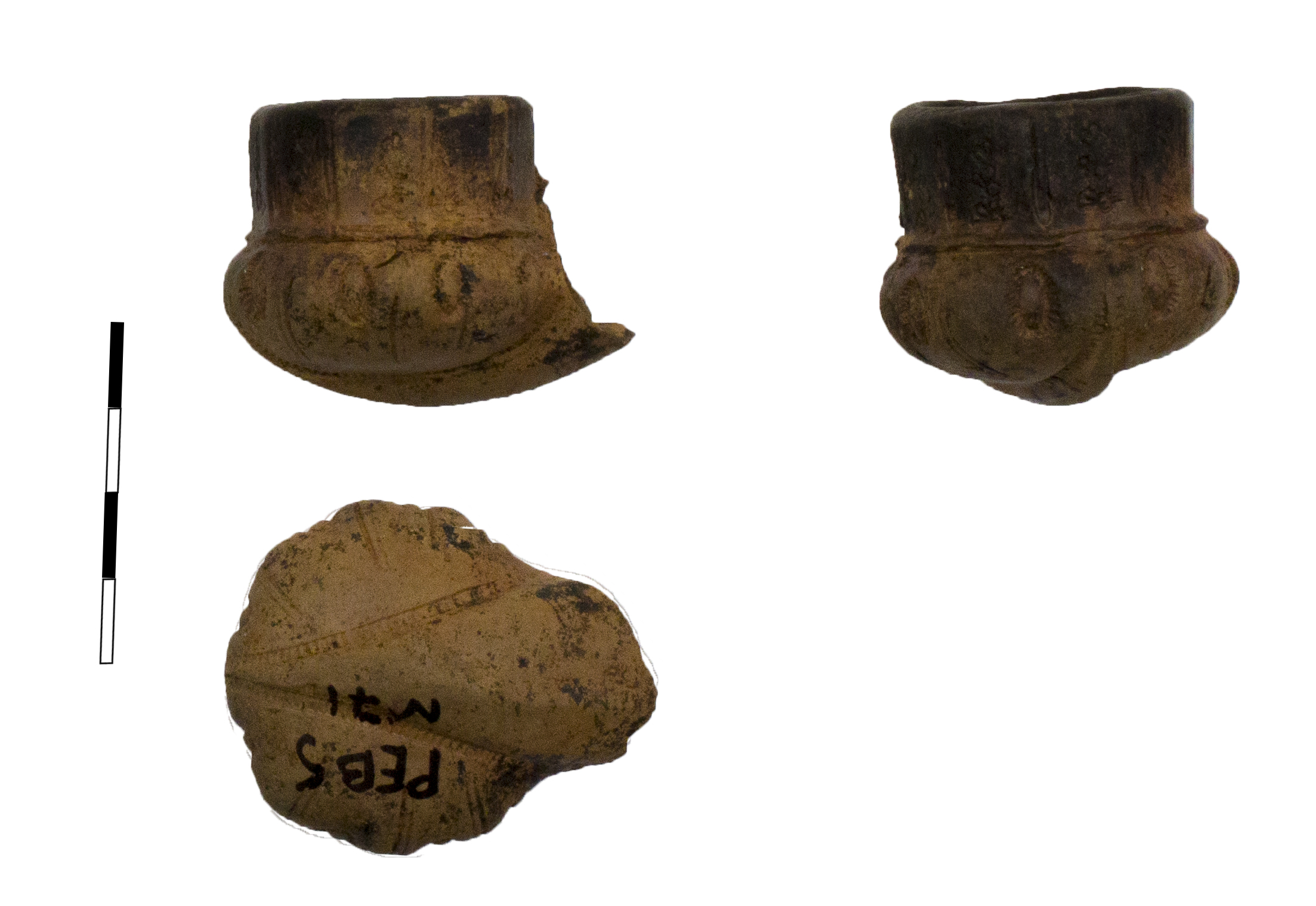 Красноглиняная курительная трубка, фасон тахта-чубук. Составляющими формы является 8-гранная втулка с килем и валиком, 10-гранные чашечка и венчик, также разделенные рельефным валиком. Ребра между гранями чашечки и венчика выделены двойными разделительными линиями, ограничивающими орнаментальные поля. Орнамент на венчике состоит из 3 рядов полупальметок, обращенных вверх. Чашечка содержит орнамент, напоминающий изображение раковины-каури. Киль и валик втулки выделены штампованным изображением зубчатого колеса.