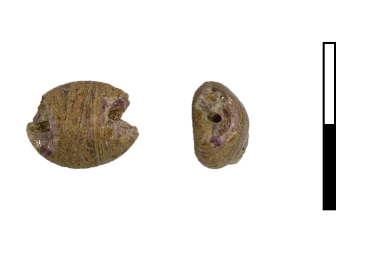 Бусина плоская из стекла сбежевого цвета с полосками. Выполнена из отрезка навитой трубочки. Поверхность расстеклована, сколы около сквозного отверстия.
