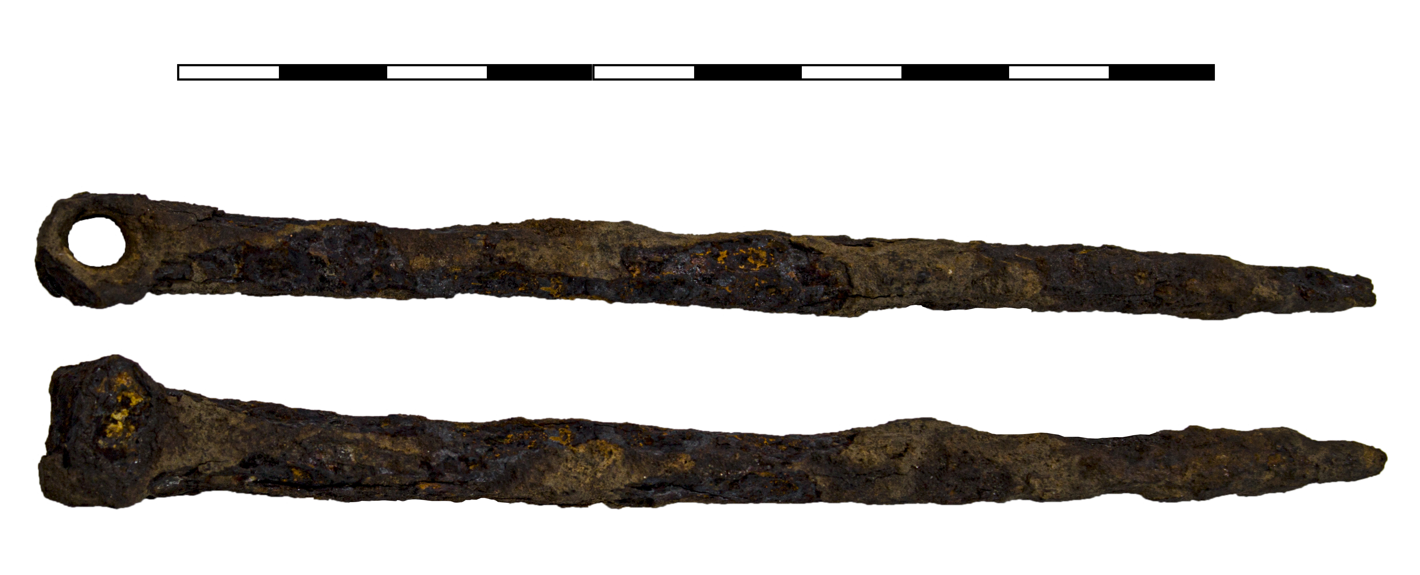 Железный предмет квадратного сечения с петлей в верхней части. Предназначение неясно.