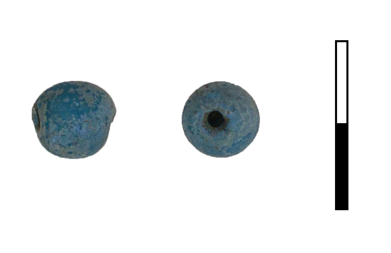 Бусина округлой формы из полупрозрачного голубого стекла, выполненная в технике тянутой трубочки с дополнительной обработкой. Поверхность покрыта белесой патиной.