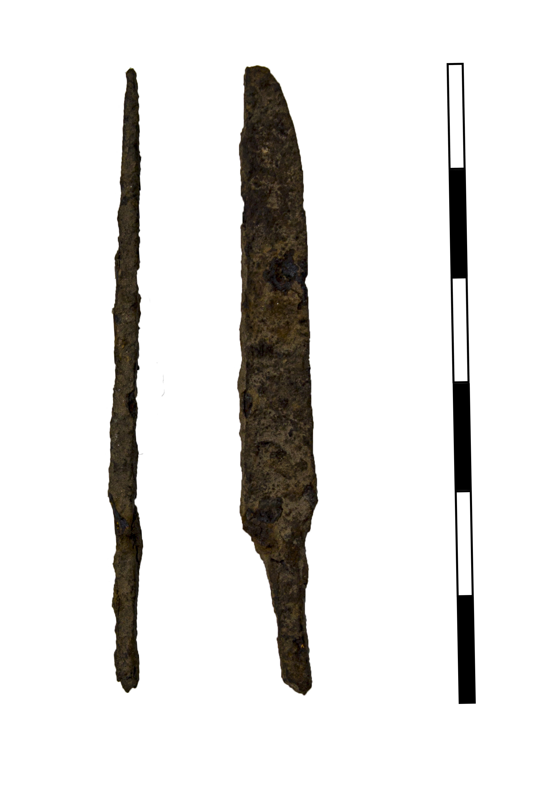 Нож универсальный с удлиненным лезвием. По результатам металлографического анализа при изготовлении использована сварка из двух полос металла.