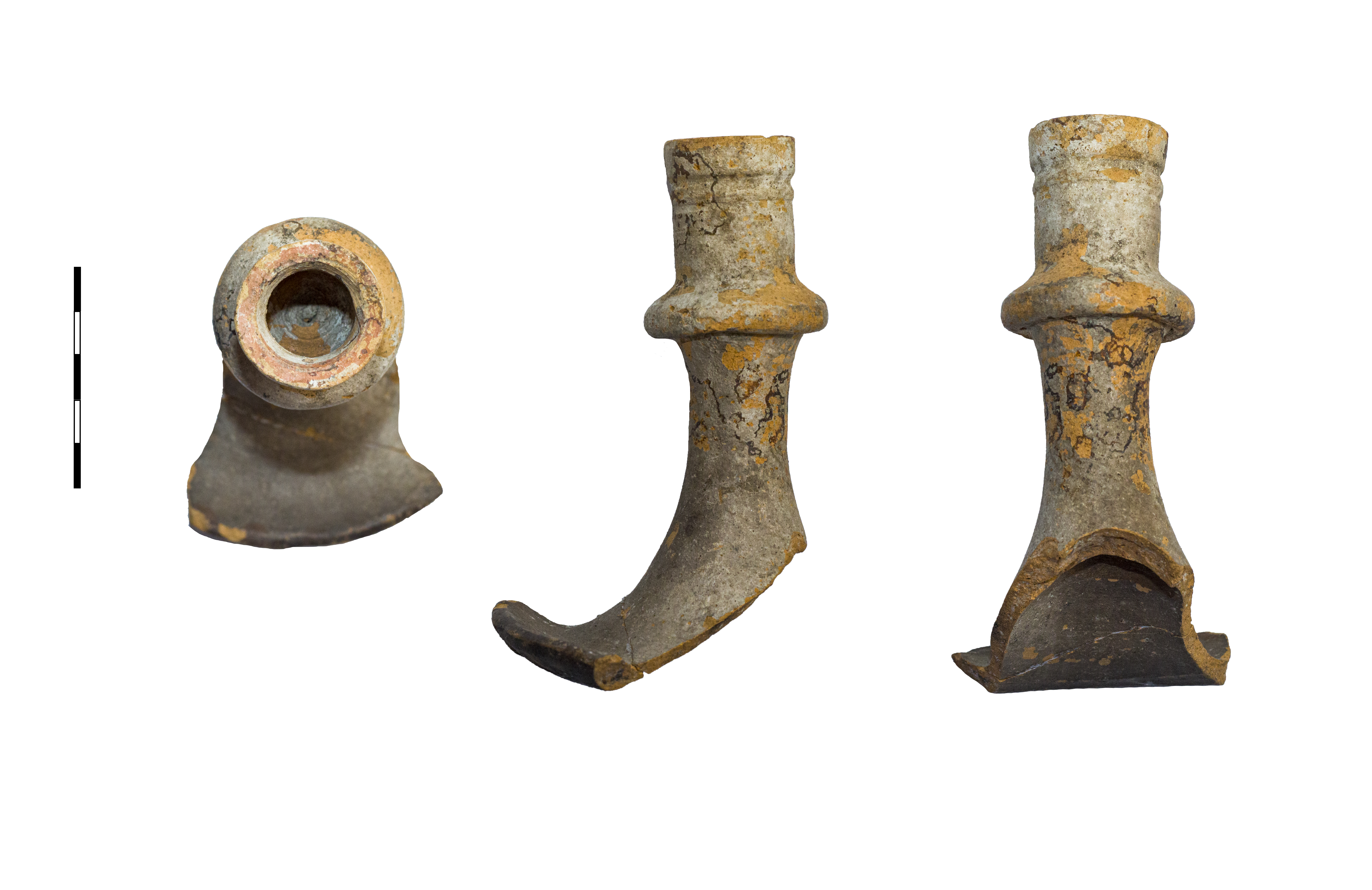 Подсвечник красноглиняный ангобированый. В верхней части две рельефные линии. Большая часть блюдца отсутствует. Изделие состоит из средней высоты стержня, в верхней части которого гнездо для свечи, отделенное дисковидным ободком диаметром 3,7 см, который мешал воску или салу свечи стекать на стержень. Переходом конической формы стержень соединялся с «поддоном» или блюдцем диаметром около 10 см.