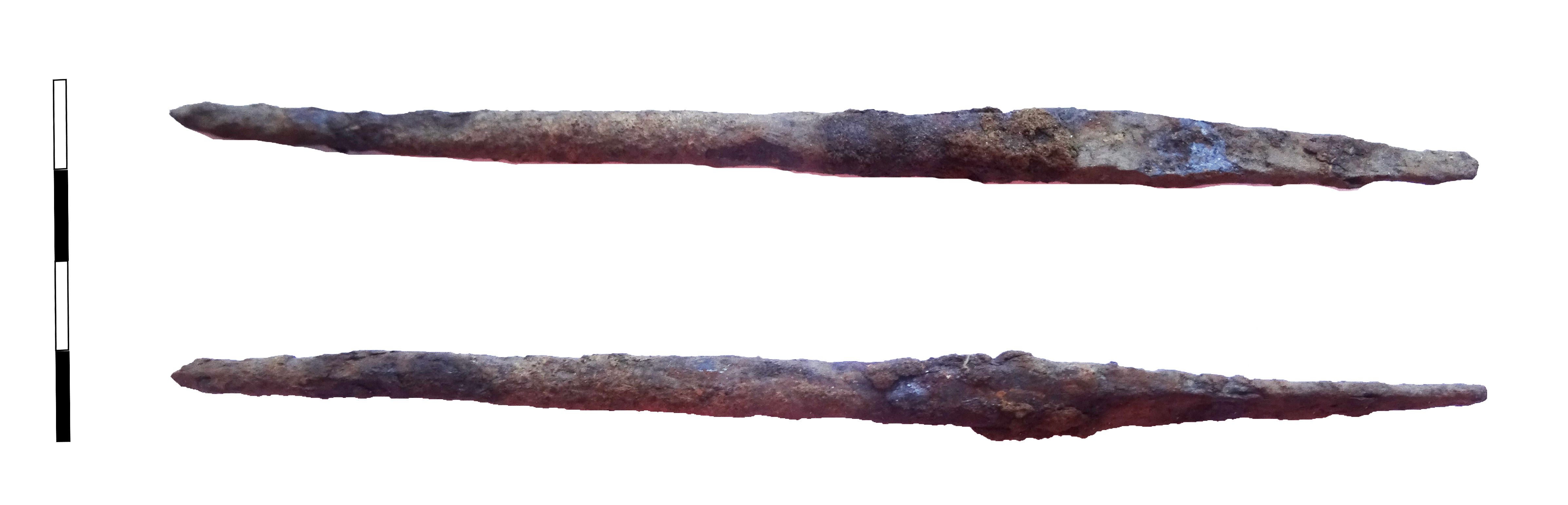 Железный предмет круглый в сечении в нижней части и прямоугольный в верхней. Предназначение неясно, возможно столярный инструмент.