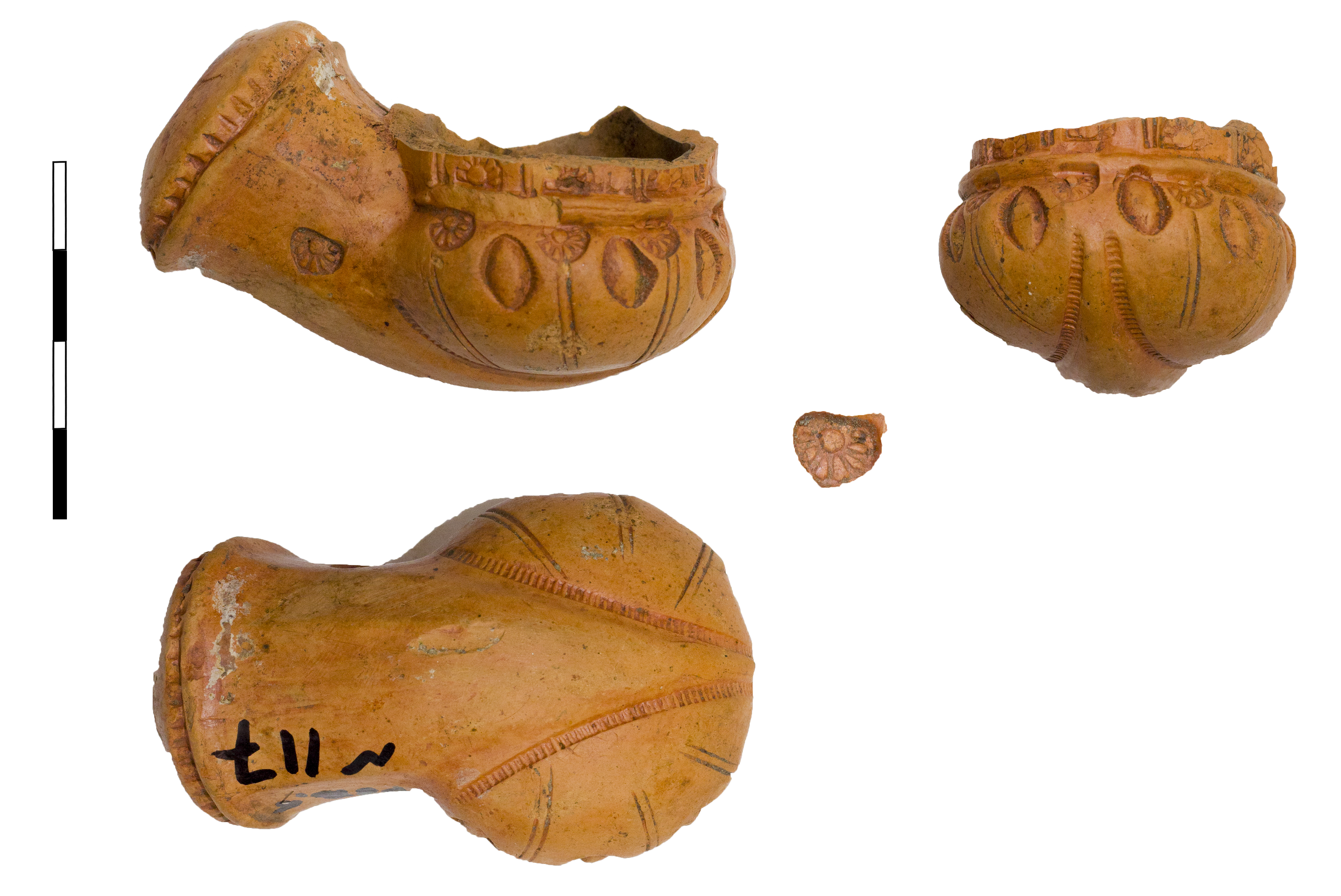 Красноглиняная курительная трубка, фасон тахта-чубук. Составляющими формы является 8-гранная втулка с килем и валиком, 10-гранные чашечка и венчик, также разделенные рельефным валиком. Ребра между гранями чашечки и венчика выделены двойными разделительными линиями, ограничивающими орнаментальные поля. Орнамент на венчике состоит из 3 рядов полупальметок, обращенных вверх. Чашечка содержит орнамент, напоминающий изображение раковины-каури. Киль и валик втулки выделены штампованным изображением зубчатого колеса.