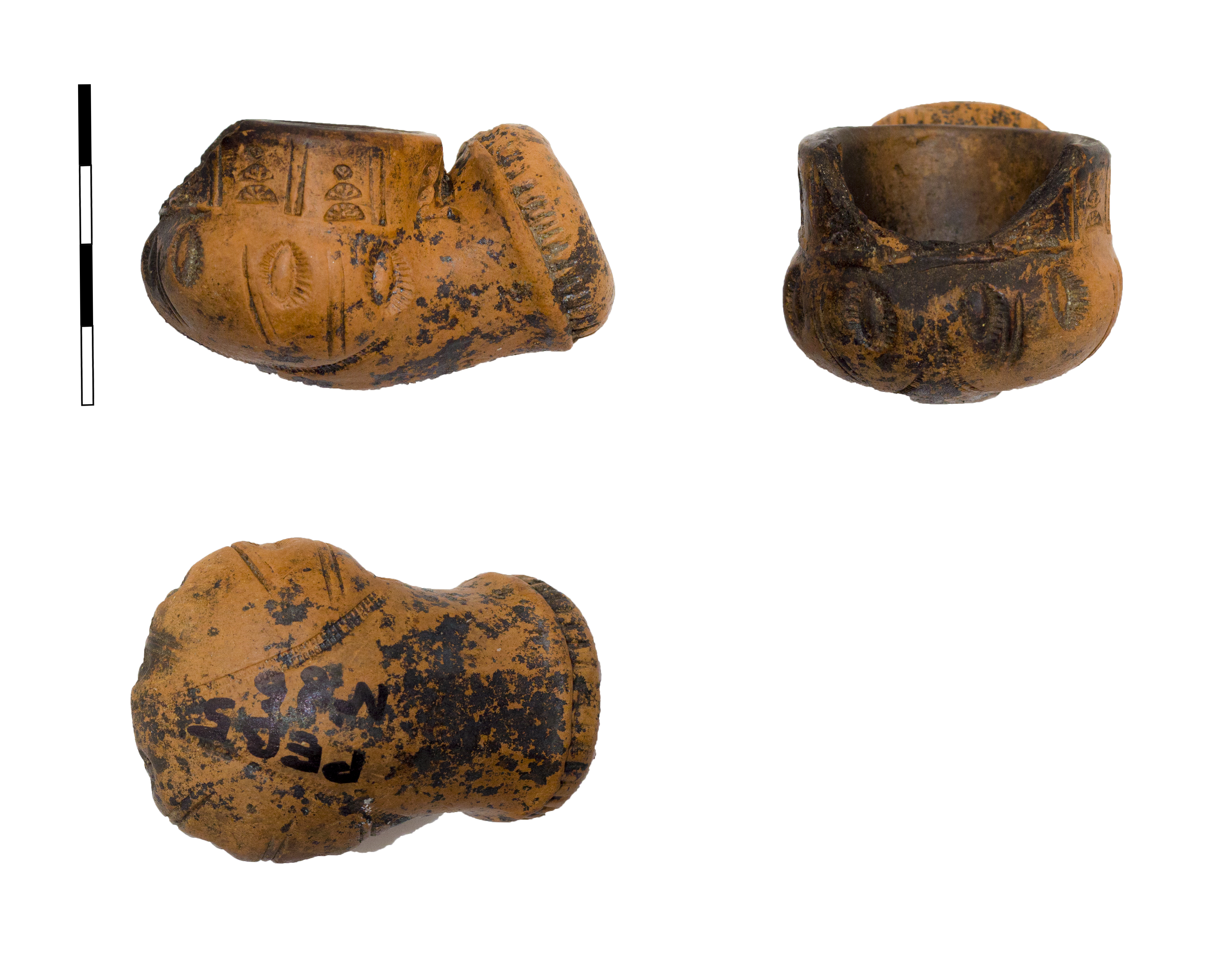 Красноглиняная курительная трубка, фасон тахта-чубук. Составляющими формы является 8-гранная втулка с килем и валиком, 10-гранные чашечка и венчик, также разделенные рельефным валиком. Ребра между гранями чашечки и венчика выделены двойными разделительными линиями, ограничивающими орнаментальные поля. Орнамент на венчике состоит из 3 рядов полупальметок, обращенных вверх. Чашечка содержит орнамент, напоминающий изображение раковины-каури. Киль и валик втулки выделены штампованным изображением зубчатого колеса.