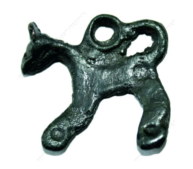 Плоская бронзовая подвеска, изображающая некое животное с двумя согнутыми ногами и свернутым в овальную петлю хвостом. Хвост соединён с круглым кольцом для подвешиавния, в результате чего в верхней части образованы два отверстия. На голове с узкой рельефной мордочкой - плоская пластинка ( уши, рога?), развёрнутая перпендикулярно фигурке. На концах ног - круглые углубления.