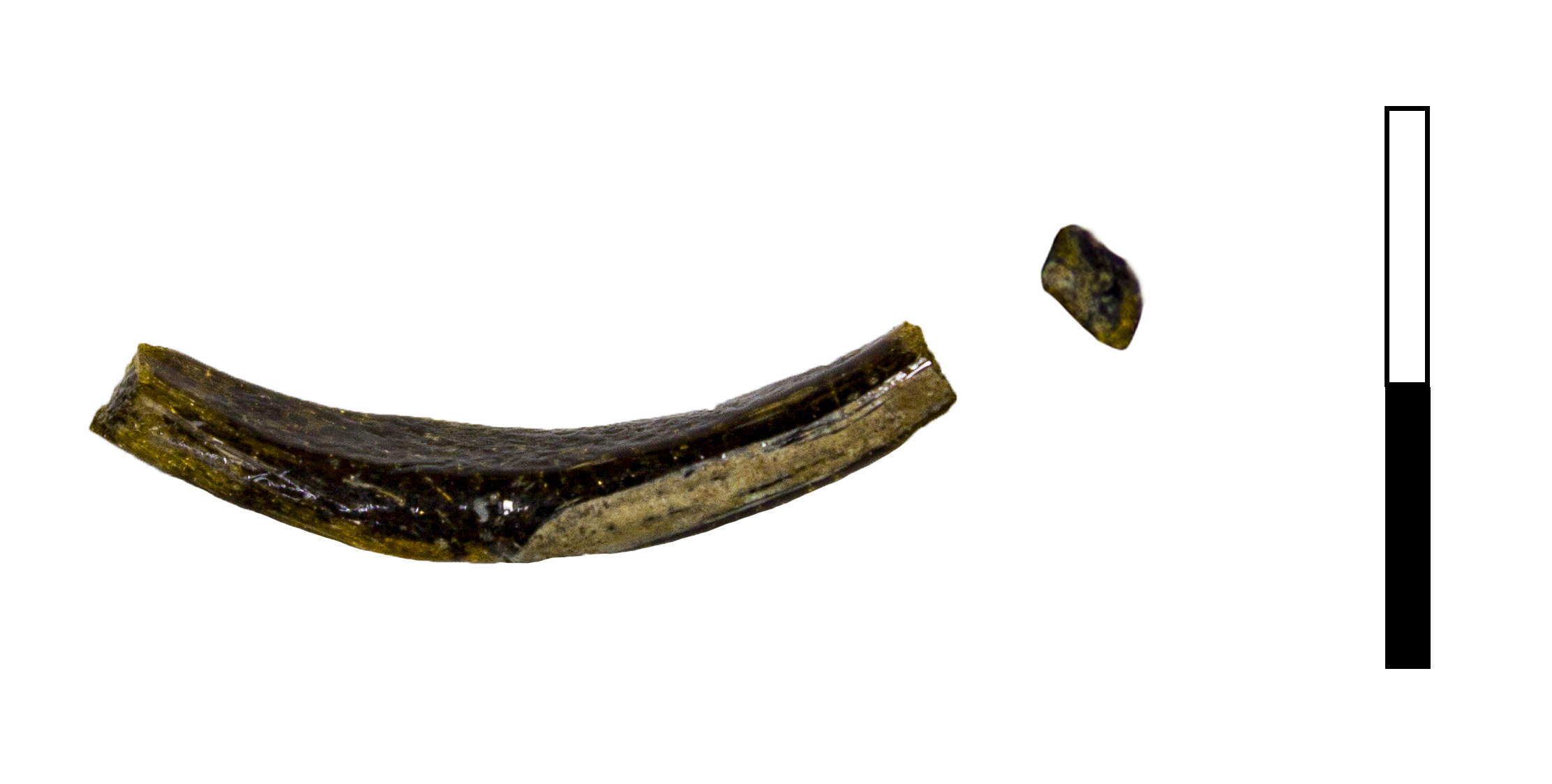 Фрагмент гладкого браслета из коричневого прозрачного стекла. С одной сторон фрагмента стержень уплощен. Диаметр стержня 4 мм. Диаметр обруча – 5 см. Поверхность блестящая, расстеклованая, с пятнами патины.