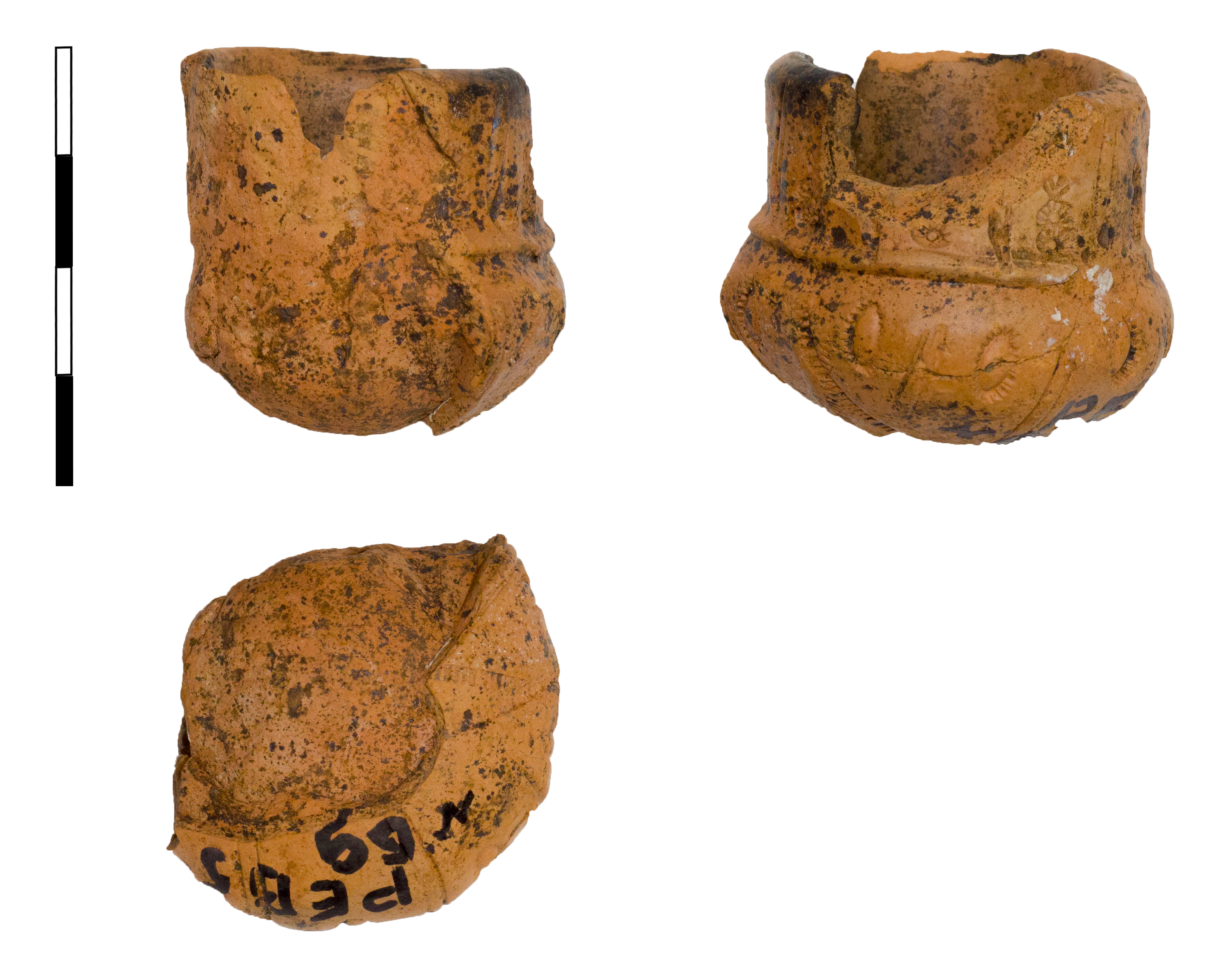 Красноглиняная курительная трубка, фасон тахта-чубук. Составляющими формы является 8-гранная втулка с килем и валиком, 10-гранные чашечка и венчик, также разделенные рельефным валиком. Ребра между гранями чашечки и венчика выделены двойными разделительными линиями, ограничивающими орнаментальные поля. Орнамент на венчике состоит из 3 рядов полупальметок, обращенных вверх. Чашечка содержит орнамент, напоминающий изображение раковины-каури. Киль и валик втулки выделены штампованным изображением зубчатого колеса.