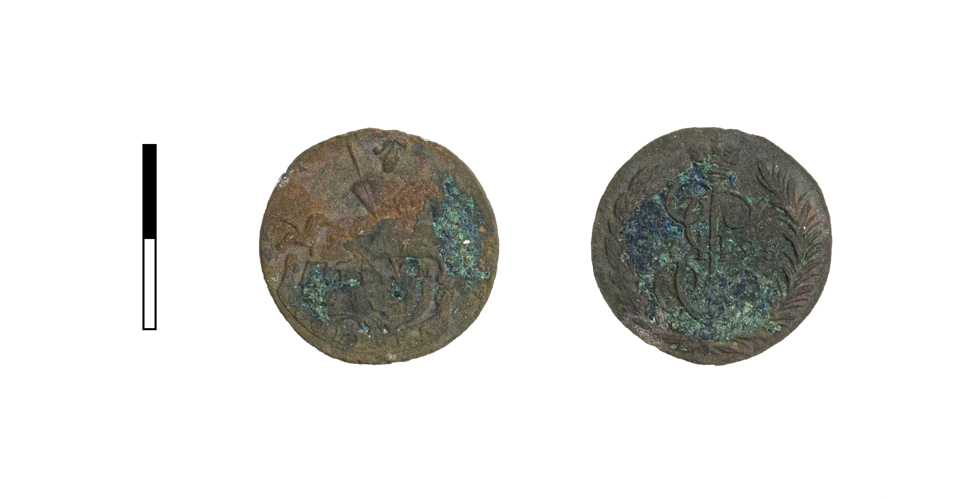 Реверс: В центре аверса - Георгий Победоносец на коне, поражающий змия длинным копьём (голова змия справа). Под конём — буквы «Е» и «М». У нижнего края находится изогнутая бандероль с обозначением денежной единицы: КОПЕИКА. Гурт сетчатый.