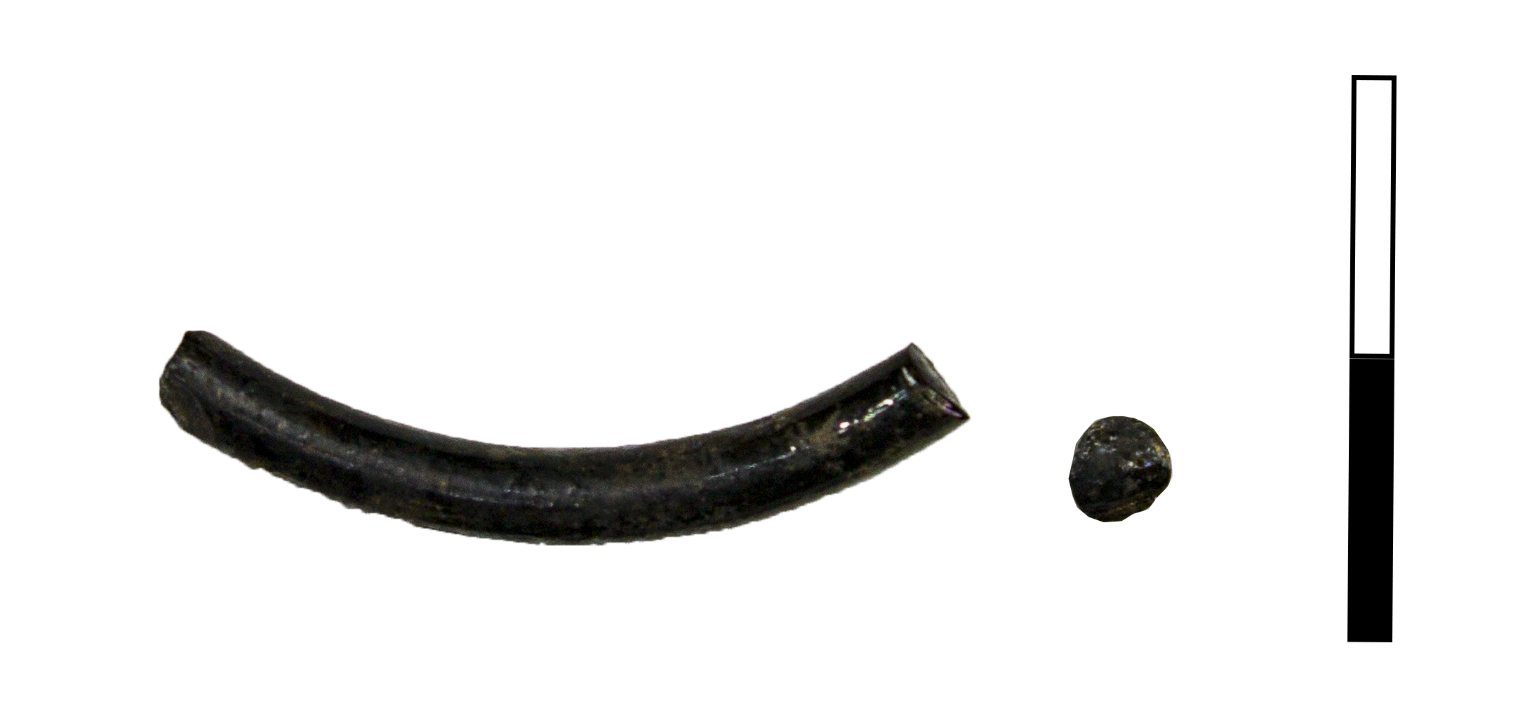 Фрагмент гладкого браслета из черного непрозрачного стекла. Диаметр стержня 3 мм. Диаметр обруча – 5 см. Поверхность покрыта белесой патиной.