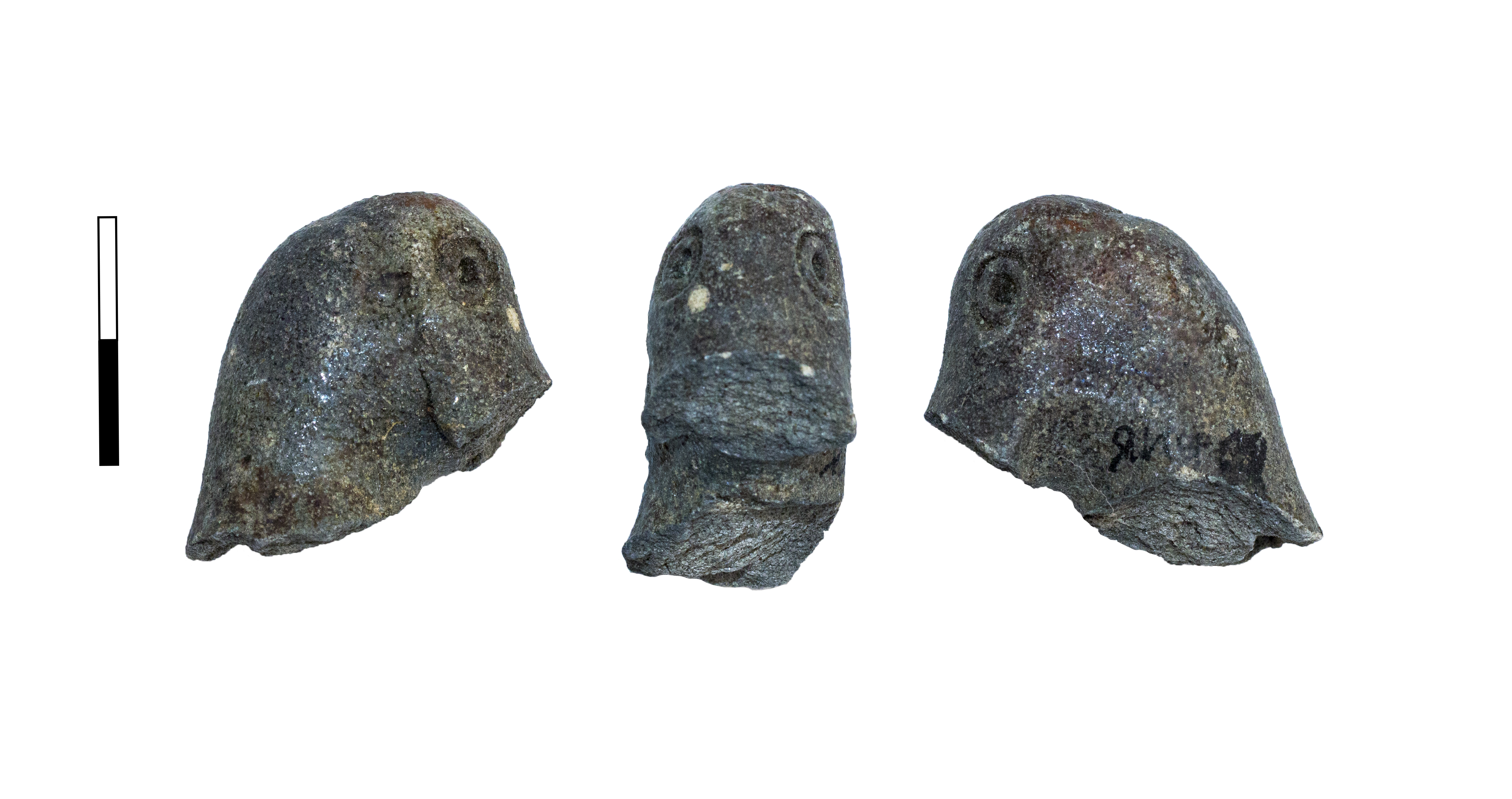 Ф-т белогллиняной поливной уточки-свистульки. Сохранилась голова с прорисованными глазами и орнаментом на макушке. Полива темно-бордового цвета, пережженная.