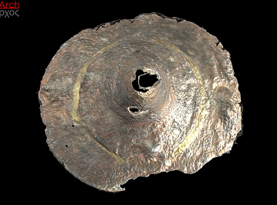 Выполнено в виде воронкообразной железной втулки полого конуса, по нижнему широкому краю которой сохранились следы заклепок, соединявших ее со шлемом. Расширенная нижняя часть инкрустирована способом всечки / врезной таушировки бронзовым пояском (ширина 0,2 см), располагающимся на 1,5 см от основания. Навершие принадлежит шлему типа II (сферо-коническому) (классификация А.Н. Кирпичникова). Диаметр основания - 5 см; диаметр основания в вершине - 0,4 см; высота - 5,7 см; толщина - 0,2 см.