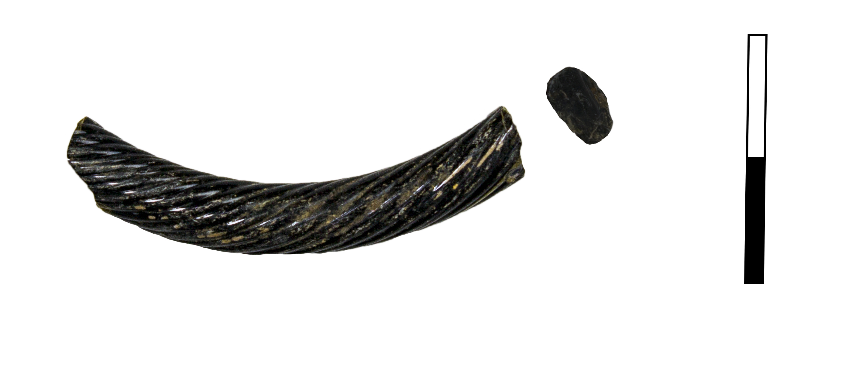 Фрагмент крученого браслета.. Перекрут на данном фрагменте браслета равномерный, мелкий. Диаметр стержня –5 мм, диаметр самого браслета 5 см. Стекло непрозрачное, черного цвета, поверхность блестящая, без патины, концы расстеклованы.