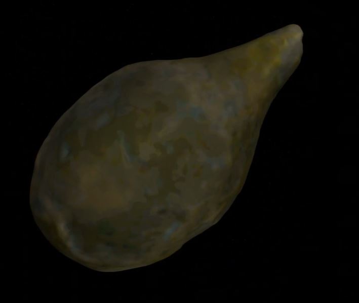 Погремушка овальной формы, сужающаяся к одному концу. Покрыта желто-зеленой поливой, с одной стороны имеется скол. Возможно, часть более сложной игрушки и на месте скола должна была располагаться головка птички. По цвету и качеству поливы и сопровождающему материалу (стеклянные браслеты, бусы и др.) может быть датирована не позднее рубежа XIII-XIV веков.