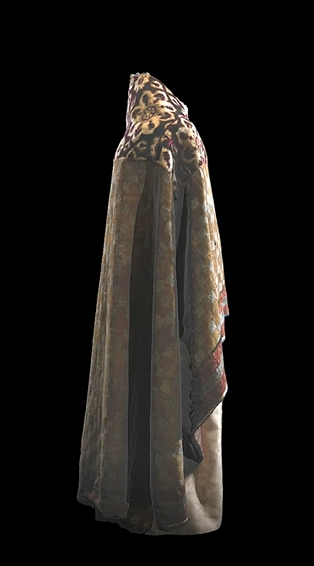 Наша фелонь сходна с облачениями XVI века из Троице-Сергиева монастыря, но отличается архаичностью форм, оплечьем иного абриса и плавно очерченным широким вырезом спереди, доходящим до колен. Золотой иранский атлас и греческая парча основной части изделия датируются XVI веком, а шитое жемчугом и украшенное камнями оплечье, утраченное при разграблении Успенского собора осенью 1608 г., было заменено оплечьем из турецкого атласа XVII в., в том же веке, видимо, были заменены опушье подольника и часть пуговиц. Вторичная реставрация проходила в XIX веке, когда к указанным материалам добавился шелк ("шанжан") и новые пуговицы.