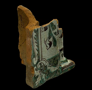 Фрагмент поливного изразца с зелено-коричневым растительным орнаментом по белому фону.