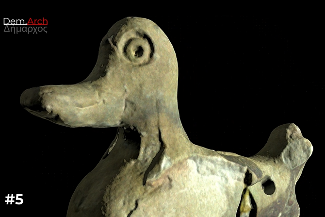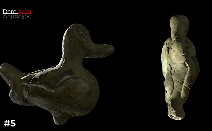 Белоглиняная уточка-свистулька. Отбито крыло, есть сквозное повреждение на боку. Сохранились функции свистульки, имеет трезвучие G-dur. Но звучание не идеально, интонация плавающая.