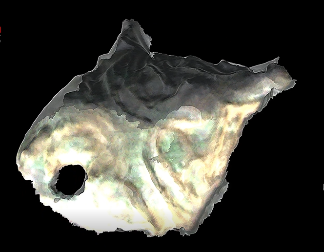 Изделие из медного сплава в виде выпуклой пластины с изображением человеческого лица шириной 1,2 см, длиной 1,78 см. В нижней части от изделия отходит стержень с обломаны краем, возможно, подобные стержни отходили и с боков пластины, один из них сохранился в виде небольшого выступа. В верхней части сквозное отверстие диаметром 2 мм.