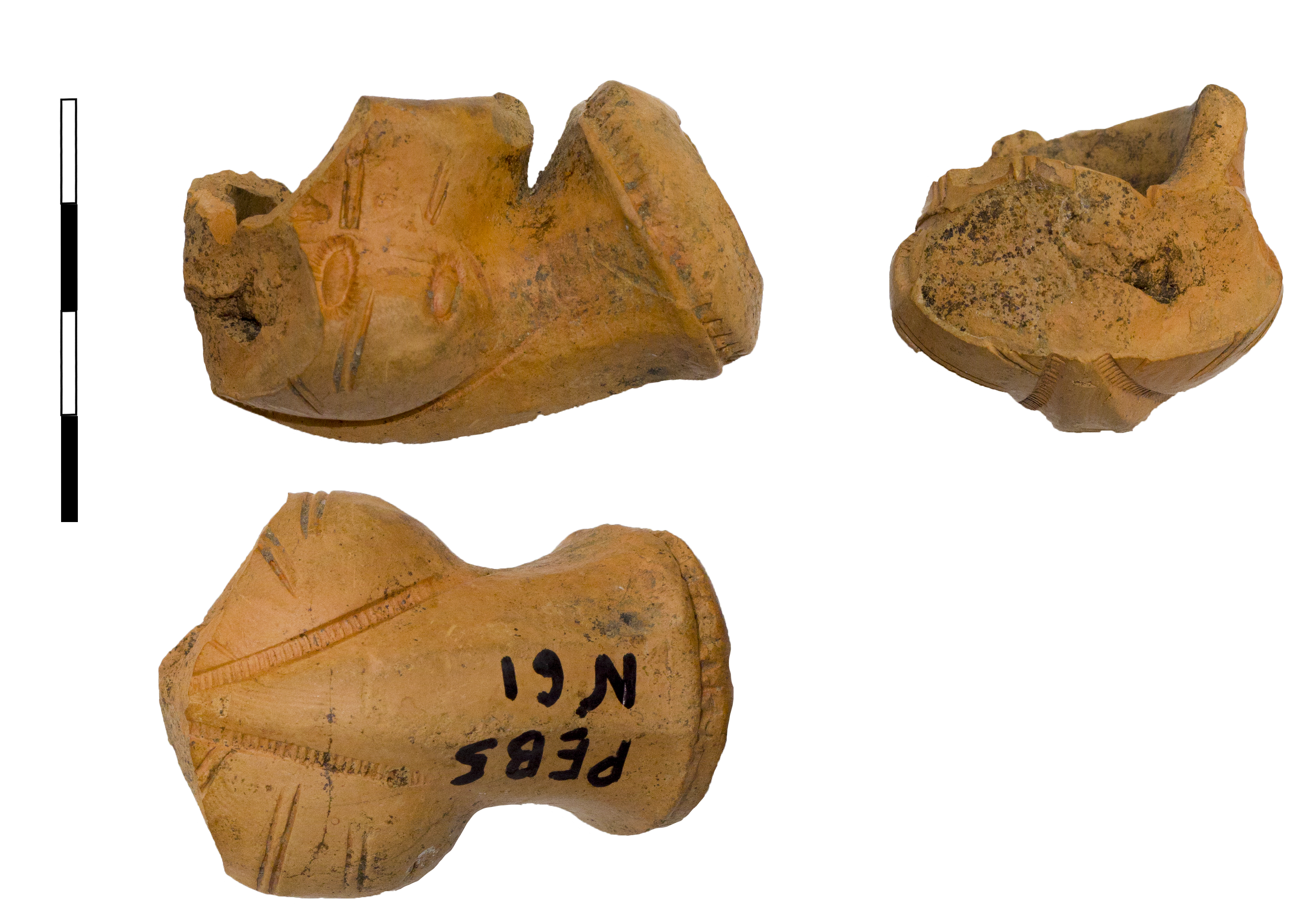 Красноглиняная курительная трубка, фасон тахта-чубук. Составляющими формы является 8-гранная втулка с килем и валиком, 10-гранные чашечка и венчик, также разделенные рельефным валиком. Ребра между гранями чашечки и венчика выделены двойными разделительными линиями, ограничивающими орнаментальные поля. Орнамент на венчике состоит из 3 рядов полупальметок, обращенных вверх. Чашечка содержит орнамент, напоминающий изображение раковины-каури. Киль и валик втулки выделены штампованным изображением зубчатого колеса.
