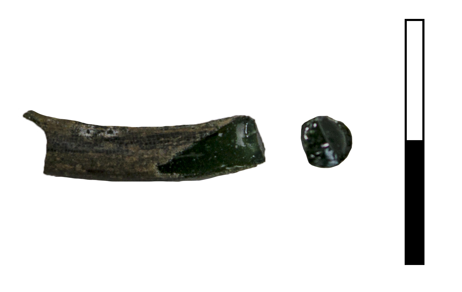 Браслет гладкий из стекла зеленого цвета с перевитьем. Сечение округлое. Выполнен простым свободным вытягиванием стеклянного дрота и формованием его в кольцо. Поверхность патинирована.