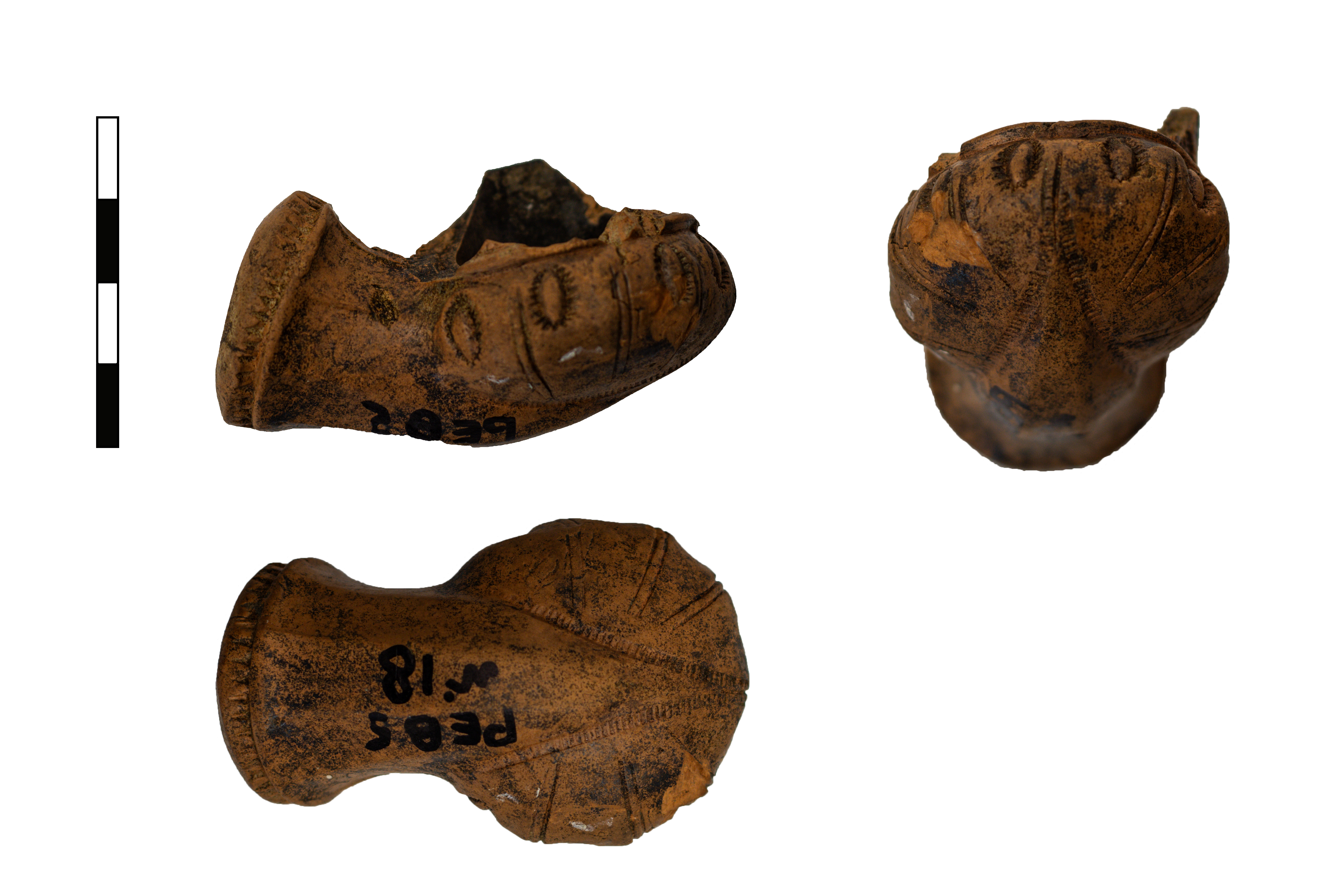 Красноглиняная курительная трубка, фасон тахта-чубук. Составляющими формы является 8-гранная втулка с килем и валиком, 10-гранные чашечка и венчик, также разделенные рельефным валиком. Ребра между гранями чашечки и венчика выделены двойными разделительными линиями, ограничивающими орнаментальные поля. Орнамент на венчике состоит из 3 рядов полупальметок, обращенных вверх. Чашечка содержит орнамент, напоминающий изображение раковины-каури. Киль и валик втулки выделены штампованным изображением зубчатого колеса.